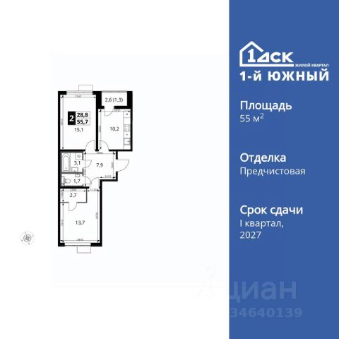 Прямая продажа от застройщика! Жилой Комплекс класса Комфорт Плюс. Продаётся 2-к квартира номер 461 общей площадью 55.7 кв.м. на 7-м этаже 24 этажного здания. Отделка Whitebox. Особенности квартиры: - МЦД-5 в пешей доступности - Квартал с южным садом - Свои 3 детских сада и 2 большие школы - Мастер-зона с гардеробной. Просторное место для отдыха и удобного хранения вещей. - Распашная планировка - отличное сочетание удобства и свободы. - Раздельный санузел - больше удобства для всех членов семьи. - Можно оборудовать рабочее место - комфорт для работы и учёбы. - Линейная кухня - функциональность и практичность в одном решении. - Гардеробная - удобство для хранения и организации вещей. - Лоджия - уютное место для отдыха и тишины. Квартира с предчистовой отделкой (White box). Вам не придется заниматься черновыми и трудоёмкими работы, а чистовую отделку и дизайн - сделайте на свой вкус. Информация о комплексе: Одно из преимуществ проектов 1- ДСК большие застекленные лоджии. Другое преимущество честный евро-формат. Во всем проекте предусмотрена система Умный дом. В состав устанавливаемого пакета устройств входит: WiFi реле для управления группами потребителей, беспроводной кран перекрытия с эл. приводом, беспроводной сенсор протечки, Яндекс Станция Мини. Его расположение можно назвать удачным за счет транспортной доступности и близости к природным объектам. По соседству лес, а в каждом дворе плодовые деревья. Весной квартал окутывает бело-розовое облако: это цветут яблони, груши, сливы. К августу в воздух наполняется ароматом созревших плодов. Зимой среди покрытых инеем деревьев протянулась лыжня. Транспортная доступность: - Общественный транспорт: Действующая ж/д станция Булатниково (в перспективе будущая МДЦ D5) в пешей доступности, всего 10-12 минут. - Личный автотранспорт: Удобный выезд на трассу М4-Дон в сторону Москвы и области 850 м, до МКАД - 1 км Внутренняя инфраструктура: Красивые продуманные подъезды - еще одно преимущество проекта 1-й Южный. Вход в сквозные подъезды есть и с улицы, и со двора. Благодаря сплошному остеклению в них всегда светло и уютно. Подъезды расположены на уровне земли, поэтому и молодым родителям с коляской, и жильцам с ограниченными возможностями вход и выход неудобств не доставят. В помещении предусмотрено место под стойку ресепшен с выводом инженерных сетей. Если жильцы решат на общем собрании, что необходим охранник или консьерж, организовать для них рабочее место можно быстро и с минимальными затратами. В подъездах предусмотрены уборные для детей и взрослых. Колясочные в каждом подъезде позволяют поддерживать порядок и чистоту на этажах. На случай прогулки с четвероногим питомцем в непогоду в подъездах устроены лапомойки. Во дворах и на общественных территориях 1-ого Южного столько всего интересного для юных обитателей. Собственные 3 детских сада и 2 больших школы буквально под окнами Изюминка проекта - пешеходный бульвар-дендрарий, он идеален для семейных прогулок. По с