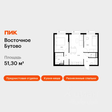 Продаётся 2-комн. квартира площадью 51,3 кв.м на 7 этаже 25 этажного дома (Корпус 48, Секция 4) проекта ПИК Восточное Бутово. Светлый просторный подъезд на уровне земли, функциональная планировка, большие окна, предчистовая отделка. Жилой квартал "Восточное Бутово" расположен в 5 км от МКАД по Симферопольскому шоссе, в Ленинском районе Московской области. Это экологически благоприятное место по соседству с Бутовским лесопарком. В 25 минутах на машине - станции метро и МЦД "Бутово". В "Восточном Бутово" уже открылись пять детских садов из десяти запланированных и одна школа из четырёх. Внутри квартала будет две поликлиники, одна из которых уже работает. В проекте два пешеходных бульвара - по одному из них уже можно гулять и кататься на велосипеде. В закрытых дворах-парках не будет автомобилей - мы построим многоуровневый паркинг, чтобы сделать район ещё более комфортным и безопасным для жителей. Артикул 641669 (Застройщик ООО "Лотан")