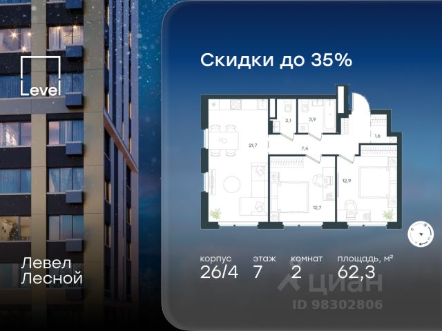 В районе, утопающем в густой зелени лесов, многочисленных парков и скверов, продаётся 2-комнатная квартира площадью 62.30 кв.м с отделкой white box. Квартира расположена на 7 этаже в жилом комплексе комфорт-класса Левел Лесной (компания Level Group/Левел групп).