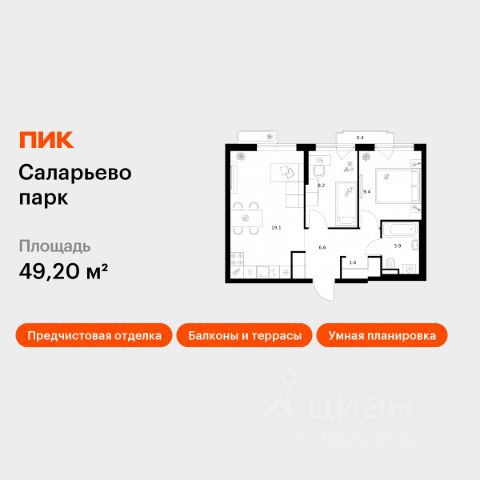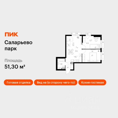 Продаётся 2-комн. квартира площадью 51,9 кв.м на 7 этаже 14 этажного дома (Корпус 69.7, Секция 7) проекта ПИК Саларьево парк. Светлый просторный подъезд на уровне земли, функциональная планировка, большие окна, c отделкой. Жилой район "Саларьево парк" расположен в Новой Москве, в четырёх километрах от МКАД по Киевскому шоссе. Две станции метро: "Саларьево" и "Филатов луг", — находятся в пешей доступности от проекта. Дойти до них можно за 510 минут. В квартале уже создана качественная среда, где есть абсолютно всё для полноценной жизни, работы и отдыха. Благодаря удобному расположению проекта всё важное будет рядом: детские сады, школы, кафе и рестораны, шопинг в торговых центрах, фитнес и даже аэропорт. Все корпуса в квартале гармонично сочетаются, образуя единую городскую среду. Между собой их объединяет невысокая этажность и натуральная цветовая гамма. Здесь приятно гулять и проводить время на улице всей семьёй. В "Саларьево парке" создана уникальная образовательная среда, включающая в себя шесть школ, рассчитанных на 6 250 учеников. Две из них уже открыты, их посещает 2 300 детей. Также на территории "Саларьево парка" находится 12 детских садов, один из которых с бассейном. Сейчас уже открыты 7 садов. В "Саларьево парке" открыта уникальная игровая площадка — PlayHub "Оригами". Здесь есть ручей, горка-труба и рельефные холмы. Взрослые смогут отдохнуть в уютном кафе, пока дети играют. Также на территории проекта есть SportHub — большая спортивная зона, разделённая по интересам и возрастам. Здесь можно заниматься разными видами спорта: футболом, баскетболом, волейболом и стритболом. Зимой центральную часть площадки превращают в каток. Во дворах-парках жилого квартала есть места для отдыха, детские и спортивные площадки. На первых этажах домов расположены магазины, кафе и полезные сервисы. Также вблизи проекта есть несколько масштабных торговых центров. До ТЦ "Саларис" пять минут пешком, до "Рио", Metro Cash & Carry и "Леруа Мерлен" — пять минут на автомобиле. Артикул 1024157 (Застройщик ООО "Специализированный Застройщик "Тирон")
