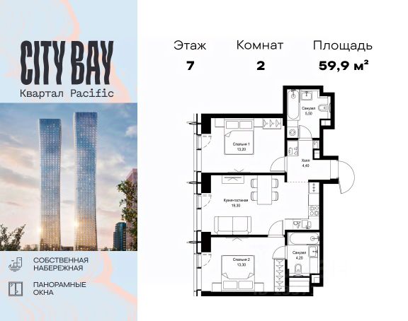 Прямая продажа от застройщика. Продаётся 2-комнатная квартира общей площадью 61.60 м² без отделки в ЖК City Вау, квартале Pacific, на 7-м этаже 9 этажного дома. Концепция жилого комплекса City Вау - настоящий город в городе с отлично развитой инфраструктурой и собственной благоустроенной набережной. На территории жилого комплекса расположено пять кварталов - Atlantic, Pacific, Indian, North, Cliff. Жилой квартал City Вау отличается оригинальной концепцией и выделяется среди других проектов такими характеристиками как: - Архитектура, - Виды из окон, - Природное окружение, вызывая гордость у жителей и восхищение у прохожих. Вся жизнь района Покровское-Стрешнево строится вокруг водных объектов: - Пойма реки Сходни с уникальной экосистемой, - Речка Химка и Химкинское водохранилище, - Москва-река, - Канал имени Москвы. Кругом вода, и местные с удовольствием этим пользуются. А сразу за рекой - центр водного спорта в Строгино с вейк-парком и яхт-клубами. Помимо воды, здесь очень много зелени: - Рядом Сходненский ковш памятник природы, естественный амфитеатр глубиной 40 метров; - Парк при усадьбе Братцево с фруктовым садом; - Дубовая роща "Маяк", - Алешкинский лес; - Лесопарк Покровское-Стрешнево с пляжами и бобрами. Главные транспортные артерии района: - Волоколамское шоссе, - Таганско-Краснопресненская линия метро и МЦД-2. Всего за 20 минут можно добраться до центра на машине или метро, а МЦД связывает ЖК City Вау с северными, восточными и юго-восточными районами. Компания MR предлагает своим клиентам специальные условия приобретения квартир в рамках программ ипотечного кредитования от банков-партнеров.