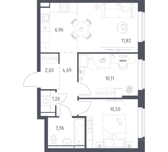 В продаже 2-комнатная квартира в корпусе 8.2 ЖК 'Горки Парк'. Квартира располагается на 7 этаже, общая площадь 59.07 м2.