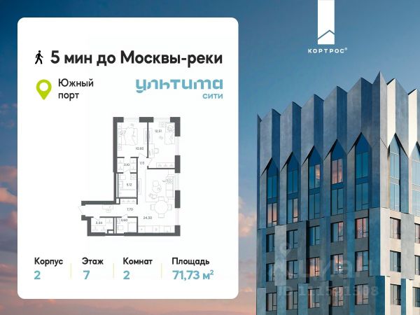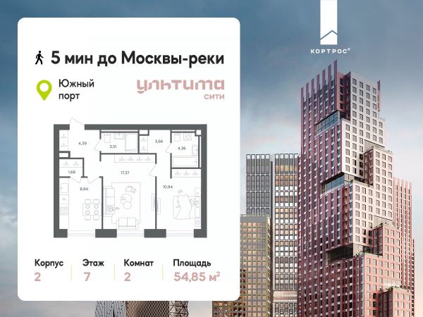 Предложение месяца от застройщика: - Скидка до 10% на ограниченный пул квартир - Рассрочка 0% на 1 год - Семейная ипотека без удорожания, ставка 4% - Ипотека для всех на весь срок, ставка 11,89% Продаётся 2-комнатная квартира от застройщика ГК "КОРТРОС" в жилом комплексе бизнес-класса УЛЬТИМА Сити. Квартира расположена на 7 этаже 52 этажного корпуса 2. Общая площадь 54,85 м². Без отделки. УЛЬТИМА Сити — жилой комплекс бизнес-класса в перспективном районе на юго-востоке Москвы. На его территории появятся 9 башен на 756 этажей, двухуровневый подземный паркинг, собственная инфраструктура, включая детский сад и школу. Всего девелопер благоустроит территорию в 2,6 га. Ближайшая станция метро — "Южный порт". Она откроется в 2028 году и будет находиться в 2-х минутах ходьбы. А прямо напротив расположится остановка водного автобуса-электрохода "Синичка". Дорога от квартала будет удобна и для автомобилистов: - до Кремля — 12 км - до МКАД — 12 км - до выезда на ТТК — 3 км - до Садового кольца — 8 км В двух корпусах первой очереди УЛЬТИМА Сити этажностью 45 и 52 реализуется 1 079 квартир с продуманными, рациональными планировочными решениями. В ассортиментной линейке представлены однокомнатные квартиры от 28,2 до 61 кв. м, двухкомнатные лоты от 44,3 до 95,4 кв. м, квартиры с тремя (71 — 115,57 кв. м) и четырьмя спальнями (106,6 — 114,97 кв. м). В экспозиции также есть квартиры с террасами, лоджиями, тремя и четырьмя санузлами, а также с функциональными нишами-кладовыми на кухнях. Запроектированы и эксклюзивные двухуровневые резиденции со вторым светом, в том числе с видом на Москву-реку, площадью от 77,7 до 141,9 кв. м. В рамках проекта запланировано строительство 9 корпусов, школы на 500 учащихся и детского сада на 225 мест. Еще будет создана продуманная инфраструктура для жителей: детские и спортивные площадки, амфитеатр для мероприятий, беседки и теплицы для садоводства, коворкинг, детский клуб и ресторан с открытой террасой. Доступ в жилой комплекс осуществляется по биометрическому контролю. Вокруг квартала будет приватная территория с видеонаблюдением и консьерж-сервисом 24/7. Лобби корпусов будут иметь двойные выходы: на улицу и во внутренний закрытый двор.
