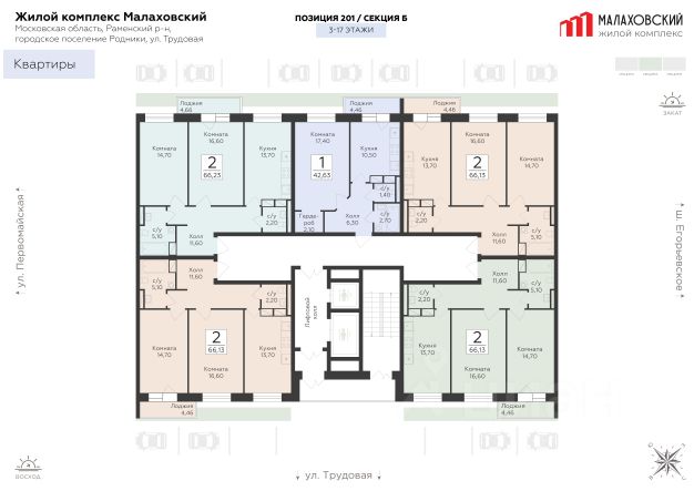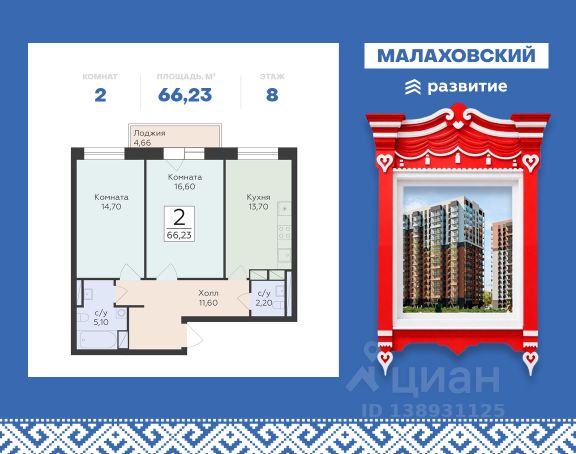 Продается 2-к квартира площадью 60.07 кв. м с черновой отделкой. Квартира расположена на 8 этаже 19 этажного дома, в 201 корпусе. "Малаховский" - жилой комплекс в Раменском районе Подмосковья, идеально подходящий для семей с детьми. Проект от федерального застройщика ГК "Развитие" находится в тихом и зеленом микрорайоне Родники и отличается удобной транспортной связью с Москвой и Люберцами. Три дома высотой 17 этажей с видами на озеро и парк, просторные квартиры, приватный двор-патио с ландшафтным дизайном и доступная инфраструктура обеспечат жителям новых квартир все преимущества городской жизни в живописном природном окружении. Транспортная доступность - Удобный выезд на Егорьевское шоссе и строящуюся магистраль МЕТК (Москва - Егорьевск - Тума - Касимов); - 18 км от МКАД; - 5 мин. до МЦД-3 "Удельная"; - 29 мин. до метро "Лермонтовский проспект". Архитектура Дома отличаются высокой тепло- и шумоизоляцией, долговечностью, высоким уровнем энергоэффективности и современным внешним видом. Фасады выполнены в спокойной цветовой гамме. Из окон с широкоформатным остеклением открываются виды на березовую рощу, озеро и зеленые дворы. Логичным продолжением архитектуры становятся просторные входные группы, где продумано всё: витражное остекление, высокие потолки, дизайнерская отделка, два выхода на обе стороны дома, а также современные лифты (грузовой и пассажирский) и колясочные. Планировочные решения Планировки комплекса "Малаховский" функциональны и эргономичны, что упрощает зонирование и расстановку мебели. Квартиры оснащены гардеробными, лоджиями с панорамным остеклением, двумя санузлами (даже в однокомнатных) и просторными прихожими. Высота потолков - 2,7 м. Квартиры сдаются с отделкой white box, которая позволит воплотить индивидуальный дизайн-проект по своему вкусу. Доступны варианты отделки "под ключ" с применением лучших дизайнерских материалов. Благоустройство В жилом комплексе тщательно продумана концепция благоустройства. Через всю территорию тянутся живописные прогулочные бульвары с ландшафтным дизайном и всесезонным озеленением. Рядом обустроено 3 современных детских площадки с мягким покрытием, а для взрослых предусмотрены уютные лаунж-зоны для общения, тихого отдыха и спорта на свежем воздухе. Двор каждого дома свободен от машин, а для дополнительного уюта и безопасности здесь установлено современное освещение. Естественным продолжением дворового ландшафта становится березовая роща с природными тропинками и небольшим водоемом, прилегающая к жилому комплексу. Инфраструктура и окружение - Наземный паркинг на 55 машино-мест и гостевая парковка; - Все повседневные сервисы (кафе, магазины, салоны красоты) прямо в вашем доме; - Фитнес-клуб, бассейн, спортивные площадки и велодорожки в многочисленных парках микрорайона Родники; - 2 школы, гимназия и детский сад в шаговой доступности; - ТЦ "Родники" с рестораном и супермаркетом; - Петропавловский парк с благоустроенным детским городком и волейбольной площадко