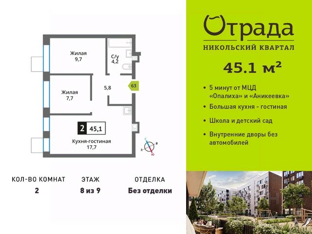 Двухкомнатная квартира (евротрешка) с просторной кухней-гостиной Двухкомнатная квартира (евротрешка) с просторной кухней-гостиной в жилом комплексе комфорт-класса "Никольский квартал Отрада". Планировка выполнена по современным стандартам и отличается повышенным комфортом. Квартал расположен в удачной локации, которая сочетает благоприятную экологическую обстановку с прекрасной транспортной доступностью. Проектом предусмотрены 14 корпусов высотой 6-9 этажей, а также муниципальная школа, один муниципальный и один частный детский сад, два наземных многоуровневых паркинга с кладовыми помещениями. Надежный застройщик ГК "Отрада" с высочайшим рейтингом 5 звезд от портала ЕРЗ. Все корпуса во всех ЖК сданы раньше срока!