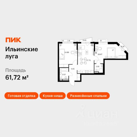Продаётся 2-комн. квартира площадью 61,72 кв.м на 8 этаже 9 этажного дома (Корпус 4.2, Секция 2) проекта ПИК Ильинские луга. Светлый просторный подъезд на уровне земли, функциональная планировка, большие окна, c отделкой. Жилой район "Ильинские луга" находится в 10 километрах от МКАД по Новорижскому шоссе, в 20 минутах на автомобиле от станций метро "Волоколамская", "Тушинская" и "Строгино". В будущем ближе к проекту, в 9 минутах пути на машине, откроется станция "Ильинская" Рублёво-Архангельской линии, которая будет соединять Арбатско-Покровскую линию и Большую кольцевую линию. Сейчас в квартале начались продажи в корпусах 3.2, 3.3, 3.4, 3.5 и 3.6. "Ильинские луга" — масштабный проект, в который входит девять детских садов, четыре школы и поликлиника. Он строится в престижном и экологичном районе среди лесов и памятников природы. За 5 минут от жилого квартала можно доехать до Рублёво-Успенского шоссе, а за 30 минут — до центра Москвы. До крупного торгового центра "РИГАМОЛЛ" всего 5 минут на автомобиле, а до ТЦ "Твой дом" и гипермаркета "Глобус" — 10 минут. В "Ильинских лугах" строятся только девятиэтажные дома — такая архитектура соответствует спокойной жизни за городом. В каждом дворе-парке есть места для отдыха, детские и спортивные площадки. А ещё, здесь уже открыт большой PlayHub "Гравити" — современное игровое пространство с космической тематикой, холмами, зонами для игр и отдыха жителей любого возраста. На первых этажах уже работают магазины, кафе и пекарни. Места для отдыха от "Ильинских лугов" тоже недалеко: 10 минут на машине — и вы в музее-усадьбе "Архангельское". Также рядом находится Лохин остров — памятник природы, где водятся речные черепахи, есть места для кемпинга и возможность сплавиться по реке. Артикул 1015487 (Застройщик ООО "СЗ "ГРАДОЛИМП")