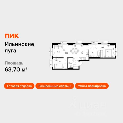 Продаётся 2-комн. квартира площадью 63,7 кв.м на 8 этаже 9 этажного дома (Корпус 3.1, Секция 2) проекта ПИК Ильинские луга. Светлый просторный подъезд на уровне земли, функциональная планировка, большие окна, c отделкой. Жилой район "Ильинские луга" находится в 10 километрах от МКАД по Новорижскому шоссе, в 20 минутах на автомобиле от станций метро "Волоколамская", "Тушинская" и "Строгино". В будущем ближе к проекту, в 9 минутах пути на машине, откроется станция "Ильинская" Рублёво-Архангельской линии, которая будет соединять Арбатско-Покровскую линию и Большую кольцевую линию. Сейчас в квартале начались продажи в корпусах 3.2, 3.3, 3.4, 3.5 и 3.6. "Ильинские луга" — масштабный проект, в который входит девять детских садов, четыре школы и поликлиника. Он строится в престижном и экологичном районе среди лесов и памятников природы. За 5 минут от жилого квартала можно доехать до Рублёво-Успенского шоссе, а за 30 минут — до центра Москвы. До крупного торгового центра "РИГАМОЛЛ" всего 5 минут на автомобиле, а до ТЦ "Твой дом" и гипермаркета "Глобус" — 10 минут. В "Ильинских лугах" строятся только девятиэтажные дома — такая архитектура соответствует спокойной жизни за городом. В каждом дворе-парке есть места для отдыха, детские и спортивные площадки. А ещё, здесь уже открыт большой PlayHub "Гравити" — современное игровое пространство с космической тематикой, холмами, зонами для игр и отдыха жителей любого возраста. На первых этажах уже работают магазины, кафе и пекарни. Места для отдыха от "Ильинских лугов" тоже недалеко: 10 минут на машине — и вы в музее-усадьбе "Архангельское". Также рядом находится Лохин остров — памятник природы, где водятся речные черепахи, есть места для кемпинга и возможность сплавиться по реке. Артикул 1001589 (Застройщик ООО "СЗ "ГРАДОЛИМП")