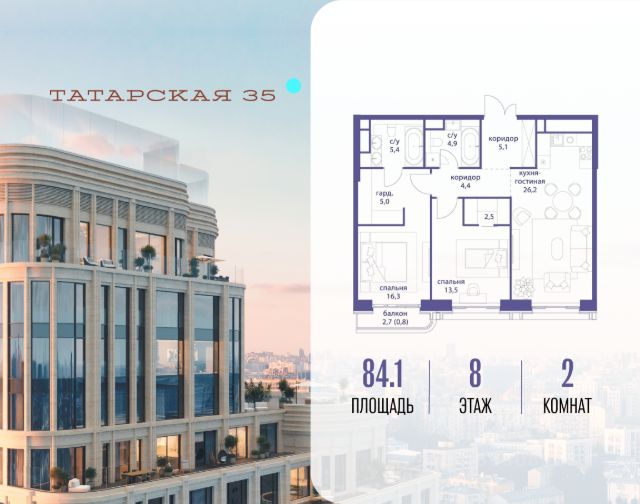 Продается просторная квартира площадью 84.10 м2 в жилом комплексе ТАТАРСКАЯ, 35. Квартира находится в 1 секции корпуса 2. Этаж 8-й из 19. Квартира без чистовой отделки, с просторной кухней 26.20 м2. Жилая площадь 29.80 м2. Высота потолка от 3.50. ТАТАРСКАЯ, 35 - новая архитектурная доминанта Замоскворечья, достопримечательность на фотопанорамах исторического центра Москвы. Элитный дом, созданный для тех, кто умеет смотреть далеко вперед, мыслить масштабно и воплощать собственный сценарий жизни. Вдохновляющие прогулки по променаду набережной, в уютных переулках, в парке "Зарядье", в Михайловском саду и Репинском сквере. Наслаждение высоким искусством в Третьяковской галерее, Доме Музыки, театральном музее им. А.А. Бахрушина, театре на Малой Ордынке. За окнами - Кремль, высотка на Котельнической, панорамы Замоскворечья и острова Балчуг, огни Садового кольца. Собственные спорт-румы, детская, репетиторская, бьюти-пространства, деловое пространство с коворкингом, переговорной и сигарной. Собственный трехуровневый фитнесс-центр с бассейном, тренажерным залом, сауной, хаммамом, массажным кабинетом. Площадь двора - 1,8 га, половина территории покрыта деревьями, кустарниками и лужайками. Дом расположен внутри Садового кольца - отсюда в считанные минуты можно добраться до важнейших мест столицы: достопримечательностей и парков, театров и ресторанов, деловых и административных центров. 7 минут до Кремля на автомобиле, 15 минут до Третьяковской галереи и 8 минут до Садового кольца пешком. Планировочные решения и визуализации предварительны, возможны изменения.