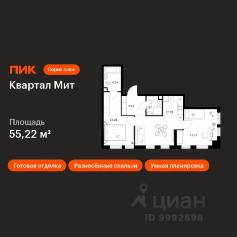 Продаётся 2-комн. квартира площадью 55,22 кв.м на 8 этаже 32 этажного дома (Корпус 3.4, Секция 4) проекта ПИК Квартал Мит. Светлый просторный подъезд на уровне земли, функциональная планировка, большие окна, c отделкой. "Квартал Мит" строится в экологически чистом районе Митино, где по соседству расположен большой лесопарк, а с двух сторон протекают реки Сходня и Журавка. Для семей с детьми здесь появится школа и два детских сада. В 20 минутах пешком находится станция метро "Пятницкое шоссе", а за 10 минут на автомобиле можно доехать до МКАД. Архитектура от архитектурного бюро "Слава+" Концепция квартала сочетает эстетику и функциональность. Башня-доминанта цвета красной охры и разновысотные корпуса терракотового, белого и графитового оттенков формируют узнаваемый силуэт современного городского пространства. Просторные террасы, разнообразные балконы и окна в пол придают облику динамичность и дарят квартирам уютные места для отдыха. Первые этажи с панорамными окнами создают сцену для яркой городской жизни. Здесь появятся пространства для прогулок, летние террасы, рестораны и коммерческие помещения. Комфорт "Серии плюс". При входе в дом жителей встретят светлые просторные лобби с высокими потолками — попасть сюда можно как со стороны улицы, так и со двора. В лобби будет зона ожидания, велосипедная и колясочная. Быстро и с комфортом подняться на нужный этаж помогут бесшумные скоростные лифты. На подземном этаже появится паркинг и индивидуальные кладовые, где удобно хранить сезонные вещи. Артикул 1034726 (Застройщик АО СЗ "ПФК")