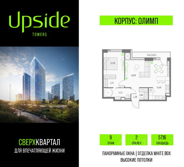Продаётся 2-комнатная квартира площадью 57.16 кв.м на 9 этаже 19 этажного корпуса Олимп в квартале небоскребов "Upside Towers". В квартире отделка White-box, c видом на корпус Эльбрус, Бизнес-парк Останкино, прогулочный бульвар, детский сад, школу, Останкинскую башню. Номер квартиры В0904. Upside Towers - технологичный квартал строится в динамично развивающемся Бутырском районе, в 3 мин. от метро, в 5 мин. от ТТК. На территории 7 га возводится 5 высотных башен от 19 до 58 этажей, названных в честь главных вершин земли. Квартиры с панорамными окнами в пол, высокими потолками и современными инженерными решениями. Благоустроенная зеленая территория включает: приватные дворы, природный комплекс, прогулочный бульвар, ландшафтный парк 2,5 га с сенсорным садом и многофункциональными игровыми и спортивными площадками. В корпусе откроются магазины, кафе и рестораны, а также другие объекты коммерческой инфраструктуры. Большое внимание в проекте уделяется созданию социальной инфраструктуры. Между "Атласом" и "Олимпом" в трехэтажном стилобате разместится уникальное пространство закрытый клуб для жителей квартала Upside Club площадью 2 000 кв. м. Здесь разместятся: каминный зал с роялем, многофункциональная детская зона c двухуровневым игровым оборудованием для малышей и дошкольников, плей-рум для подростков, домашний кинотеатр, коворкинг, переговорные и лектории. На 47 этаже башни "Атлас" откроется SKY SPA Relax с расслабляющей атмосферой, джакузи, сауной, залами для релаксации и йоги. Собственники квартир смогут в любое удобное для них время забронировать посещение спа-зоны через смарт-приложение. На крыше стилобата разместится всесезонная BBQ патио-зона с верандой и закрытыми помещениями для приготовления и отдыха. В башнях откроются смотровые террасы для резидентов с панорамными видами на город, парки, Останкинскую башню, ВДНХ, Ботанический сад и Москву-Сити. Покупая квартиру даже самого минимального размера в Upside Towers, вы получаете в пользование 2 000 м² бесплатных общественных пространств. В рамках проекта строится государственная школа и детский сад, разместится более 15 000 кв.м. коммерческой инфраструктуры. Насыщенная социальная инфраструктура формирует множество сценариев для жизни на территории квартала. В Upside Towers применяются лучшие технологии и практики, чтобы обеспечить высшее качество жизни: Воздух, не уступающий по качеству горному, обеспечит приточно-вытяжная вентиляция. Пятиступенчатая очистка воды с сохранением полезных минералов. Центральное кондиционирование. Внутрипольные конвекторы с естественной конвекцией. Современные системы безопасности и мониторинга микроклимата. Высокоскоростной интернет на всей территории, в квартирах и паркинге за счет усиления GSM-связи всех ведущих операторов. Все места в подземном паркинге оборудованы зарядками для электрокаров. Бутырский район непрерывно развивается и готовится стать новым современным деловым районом Москвы. В рамках программы "Индустриальные кварталы" комплексного р