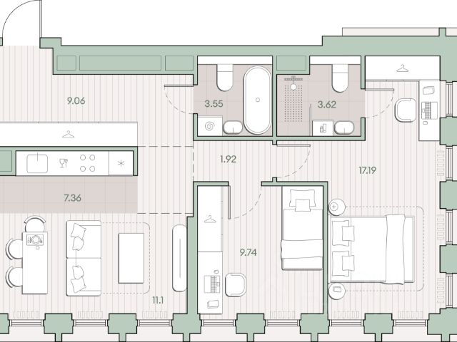 Двухкомнатная wellness-резиденция площадью 65 кв. м. на 9 этаже с видом на двор в доме премиум-класса Springs. В квартире выполнена чистовая дизайнерская отделка. Резиденция наполнена светом и воздухом, благодаря панорамному остеклению и высоким потолкам. На первом этаже дома расположены: - фитнес-центр с бассейном; - SPA с хаммамом; - бьюти-зона с массажным кабинетом. - ресторан. Все сервисы доступны исключительно для резидентов. Всего в 2 минутах ходьбы от дома находится заповедный парк Фили прекрасное место для спокойного и активного отдыха. Зеленый массив, набережная, велотропы и открытые зоны для йоги, а также шахматный клуб, летний кинотеатр, множество беседок и кофеен. До делового комплекса Москва-Сити всего 16 минут, а центр — в 14 минутах езды по Кутузовскому проспекту. Удобный выезд к Рублёвскому шоссе — отличная возможность на выходных сбежать с детьми за город, потратив на дорогу меньше получаса. Концепция благоустройства Springs, разработанная студией Wowhaus, воплощает идею взаимного проникновения парка и озеленения внутренней территории: естественная растительность, дополненная акцентами из цветников, плавно вступает во двор. В сочетании с бионической архитектурой дом является органичным продолжением природного ландшафта парка.