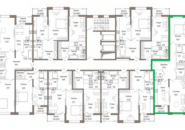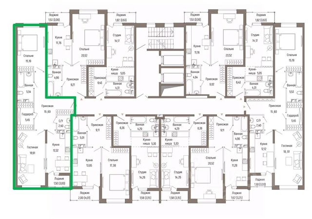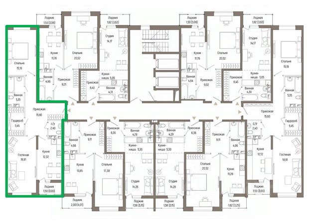 Формат Евро 3: просторная кухня-гостиная 19,8 кв.м создает комфортные условия принятия гостей, две изолированные спальни 10,6 кв.м и 10,9 кв.м.