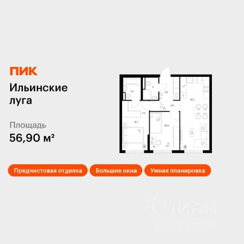 Продаётся 2-комн. квартира площадью 56,9 кв.м на 9 этаже 9 этажного дома (Корпус 4.3, Секция 4) проекта ПИК Ильинские луга. Светлый просторный подъезд на уровне земли, функциональная планировка, большие окна, предчистовая отделка. Жилой район "Ильинские луга" находится в 10 километрах от МКАД по Новорижскому шоссе, в 20 минутах на автомобиле от станций метро "Волоколамская", "Тушинская" и "Строгино". В будущем ближе к проекту, в 9 минутах пути на машине, откроется станция "Ильинская" Рублёво-Архангельской линии, которая будет соединять Арбатско-Покровскую линию и Большую кольцевую линию. Сейчас в квартале начались продажи в корпусах 3.2, 3.3, 3.4, 3.5 и 3.6. "Ильинские луга" — масштабный проект, в который входит девять детских садов, четыре школы и поликлиника. Он строится в престижном и экологичном районе среди лесов и памятников природы. За 5 минут от жилого квартала можно доехать до Рублёво-Успенского шоссе, а за 30 минут — до центра Москвы. До крупного торгового центра "РИГАМОЛЛ" всего 5 минут на автомобиле, а до ТЦ "Твой дом" и гипермаркета "Глобус" — 10 минут. В "Ильинских лугах" строятся только девятиэтажные дома — такая архитектура соответствует спокойной жизни за городом. В каждом дворе-парке есть места для отдыха, детские и спортивные площадки. А ещё, здесь уже открыт большой PlayHub "Гравити" — современное игровое пространство с космической тематикой, холмами, зонами для игр и отдыха жителей любого возраста. На первых этажах уже работают магазины, кафе и пекарни. Места для отдыха от "Ильинских лугов" тоже недалеко: 10 минут на машине — и вы в музее-усадьбе "Архангельское". Также рядом находится Лохин остров — памятник природы, где водятся речные черепахи, есть места для кемпинга и возможность сплавиться по реке. Артикул 1012194 (Застройщик ООО "СЗ "ГРАДОЛИМП")