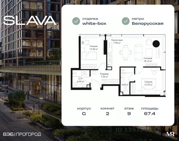 Квартиры премиум-класса в жилом комплексе SLAVA у м. "Белорусская" от застройщика. В продаже 2-комнатная квартира площадью 67.40 м² на 9-м этаже корпуса G. Новый современный жилой комплекс премиум-класса SLAVA расположен в той части центра, где традиция соединяется с прогрессивными городскими тенденциями. Здесь историческая Москва встречается с передовым миром. Популярные театры и старинные церкви соседствуют с современным деловым кварталом и гастрономическим кластером Депо. SLAVA находится всего в 5 мин. пешком от м. "Белорусская", по-новому открывая Ленинградский проспект. Проект был разработан легендарным архитектором Хельмутом Яном, основателем чикагского архитектурного бюро Jahn. Его работы отмечены множеством наград и реализованы в мегаполисах по всему миру. По замыслу архитекторов, жилой комплекс образуют четыре высотные башни, соединенные одноэтажным стилобатом "Хронограф". Здесь, на первом уровне, открытые и закрытые общественные пространства: небольшие сады, места для встреч и отдыха, кафе, рестораны, магазины, спортивный центр и даже выставочное пространство. Важнейшей особенностью пространства является его всесезонность: благодаря правильной организации, ландшафтному дизайну, инженерной инфраструктуре здесь будет уютно и в жару, и в xолод, и в ненастье. На втором уровне стилобата расположится приватный парк для жильцов. Особенности комплекса: - Идеальное расположение в престижной части Москвы (10 мин. от Кремля) - Панорамное остекление - Подземный паркинг с дизайнерской отделкой - Современные инженерные системы - Продуманная внутренняя инфраструктура - Приватный сад 7700 кв.м. Расположение комплекса: - 5 минут до станции метро "Белорусская" - 3 минуты до ТТК - 8 минут до "Садового кольца" Компания MR предлагает своим клиентам специальные условия приобретения квартир в рамках программ ипотечного кредитования от банков-партнеров.