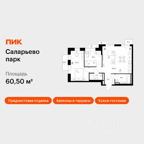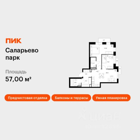 Продаётся 2-комн. квартира площадью 57 кв.м на 9 этаже 22 этажного дома (Корпус 57.3, Секция 3) проекта ПИК Саларьево парк. Светлый просторный подъезд на уровне земли, функциональная планировка, большие окна, предчистовая отделка. Жилой район "Саларьево парк" расположен в Новой Москве, в четырёх километрах от МКАД по Киевскому шоссе. Две станции метро: "Саларьево" и "Филатов луг", — находятся в пешей доступности от проекта. Дойти до них можно за 510 минут. В квартале уже создана качественная среда, где есть абсолютно всё для полноценной жизни, работы и отдыха. Благодаря удобному расположению проекта всё важное будет рядом: детские сады, школы, кафе и рестораны, шопинг в торговых центрах, фитнес и даже аэропорт. Все корпуса в квартале гармонично сочетаются, образуя единую городскую среду. Между собой их объединяет невысокая этажность и натуральная цветовая гамма. Здесь приятно гулять и проводить время на улице всей семьёй. В "Саларьево парке" создана уникальная образовательная среда, включающая в себя шесть школ, рассчитанных на 6 250 учеников. Две из них уже открыты, их посещает 2 300 детей. Также на территории "Саларьево парка" находится 12 детских садов, один из которых с бассейном. Сейчас уже открыты 7 садов. В "Саларьево парке" открыта уникальная игровая площадка — PlayHub "Оригами". Здесь есть ручей, горка-труба и рельефные холмы. Взрослые смогут отдохнуть в уютном кафе, пока дети играют. Также на территории проекта есть SportHub — большая спортивная зона, разделённая по интересам и возрастам. Здесь можно заниматься разными видами спорта: футболом, баскетболом, волейболом и стритболом. Зимой центральную часть площадки превращают в каток. Во дворах-парках жилого квартала есть места для отдыха, детские и спортивные площадки. На первых этажах домов расположены магазины, кафе и полезные сервисы. Также вблизи проекта есть несколько масштабных торговых центров. До ТЦ "Саларис" пять минут пешком, до "Рио", Metro Cash & Carry и "Леруа Мерлен" — пять минут на автомобиле. Артикул 1018382 (Застройщик ООО "Специализированный Застройщик "Тирон")