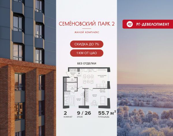 Ипотека для каждого! Полная стоимость кредита от 12,378% до 18,537%. Ставка от 0,11% в АО "Альфа-Банк", ген. лицензия ЦБ РФ 1326 от 16.01.2015. Ставка фиксируется на первые 12 месяцев, далее полная стоимость кредита от 22,025% до 24,935% ставка 21,59%. Первоначальный взнос — от 20,1% от стоимости квартиры. Срок кредитования — от 4 до 30 лет. Ипотека на весь срок! Полная стоимость кредита от 23,396% до 26,058% со ставкой 14,5%! Первоначальный взнос —от 20,01% от стоимости квартиры. Срок кредитования — от 3 до 30 лет. АО "Банк ДОМ.РФ" универсальная лицензия Банка России 2312 от 19.12.2018. Скидка 7% при покупке квартиры! Цена указана с учетом максимального размера скидки. Продается 2-к квартира 55,7 кв.м. в ЖК "Семеновский парк 2" на 9-м этаже 26 этажного дома. Компания "РГ-Девелопмент" предоставляет скидку на квартиры в жилом комплексе. Акция действительна до 28.02.2026 включительно. Чтобы воспользоваться предложением, необходимо подписать договор на приобретение недвижимости до 28.02.2026 включительно. Компания "РГ-Девелопмент" вошла в ТОП-10 девелоперов по объёму введённого жилья в "Старой Москве" по итогам 2025 года. Прямая продажа от застройщика! Квартиры без отделки. Срок сдачи корпуса - 1 кв. 2026 г. ЖК "Семеновский парк 2" - это идеальное место для того, чтобы стать вашим домом. Проект расположен в исторической части Москвы вблизи Измайловского лесопарка, в 1 км от ЦАО. 4 станции метро отделяют вас от Красной площади и 15 минут на автомобиле - от Садового кольца.
