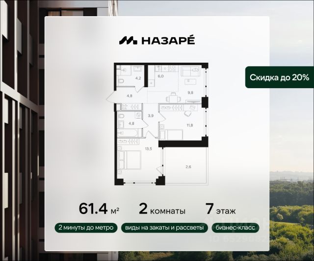 Продается 2-комнатная квартира в ЖК "НАЗАРЕ'" Общая площадь - 61.90 Тип дома - монолитный Этаж - 6 Год сдачи - 2028 Предлагается квартира площадью 61.90 кв. м в новом современном квартале на востоке Москвы, прямо у станций метро и МЦК "Бульвар Рокоссовского". Квартира располагается в корпусе 4 на 6 этаже комплекса бизнес-класса "НАЗАРЕ'". Стоимость указана с учетом скидки 20%, ваша выгода составит 5 865 644 рублей! Полная стоимость квартиры без скидки 29 328 220 рублей. Великолепная транспортная доступность: • 2 минуты ходьбы до метро и МЦК "Бульвар Рокоссовского"; • 3 минуты на авто - удобный выезд на СВХ (МСД); • 10 минут на авто до национального парка "Лосиный остров"; • 10 минут на авто до "Измайловского парка"; • 15 минут до авто до парка "Сокольники"; • 15 минут занимает выезд на ТТК, • 18 минут на авто до Садового кольца. Индивидуальная архитектура в современном стиле: • шесть башен переменной высотности от 24 до 43 этажей, в том числе одна высотная 143-метровая доминанта, которая станет достопримечательностью востока Москвы; • авторы архитектурной концепции - знаменитое бюро СПИЧ (среди их работ - башня "Федерация", новое здание Третьяковской галереи, реконструкция БСА "Лужники" и др.); • торгово-развлекательный комплекс с фитнес-центром, детской игровой комнатой и открытыми террасами прямо возле квартала; • дизайнерские лобби от бюро ABOVE ARCHITECTURE с панорамными окнами, интерьерами в теплой цветовой гамме и мягкой зоной ожидания располагаются в каждой башне; • корпуса расположены так, чтобы из окон открывались потрясающие виды на закаты и рассветы, зеленые панорамы или огни мегаполиса; Особенности расположения "НАЗАРЕ'" находится максимально близко к метро, и в то же время проект вписан в уже существующую инфраструктуру зеленого столичного района Богородское. Это обеспечивает быстрый доступ ко всем нужным объектам инфраструктуры (детские сады, школы, медцентры, магазины, салоны красоты, фитнес-клубы, футбольные поля, спортивные школы), а также к живописным зеленым зонам - национальному парку "Лосиный остров", парку "Сокольники", Черкизовскому детскому парку, Измайловскому лесопарку с усадьбой Измайлово. Собственная инфраструктура и благоустройство Шесть башен квартала будут объединены цокольным этажом, в который можно попасть как с улицы, так и со стороны лобби. Здесь разместятся необходимые для комфортной повседневной жизни кофейни, супермаркет, рестораны, магазины и многое другое. В комплексе предусмотрен вместительный двухуровневый подземный паркинг с келлерами для хранения сезонных вещей. Во дворе комплекса "НАЗАРЕ'" будут места как для спокойного отдыха и работы, так и для игр и спорта. Здесь организованы игровые площадки для детей всех возврастов, места для стритбола и тенниса, а также зона с природным ландшафтом и коворкинг с экологичной деревянной мебелью. Продается 2-комнатная квартира в ипотеку рядом с метро Преображенская площадь.