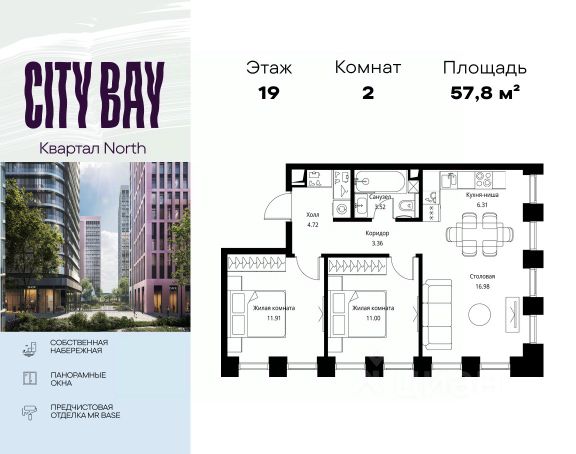 Прямая продажа от застройщика. Продаётся 2-комнатная квартира общей площадью 57.80 м² с предчистовой отделкой в ЖК City Вау, квартале North, на 19-м этаже 26 этажного дома. Концепция жилого комплекса City Вау - настоящий город в городе с отлично развитой инфраструктурой и собственной благоустроенной набережной. На территории жилого комплекса расположено пять кварталов - Atlantic, Pacific, Indian, North, Cliff. Жилой квартал City Вау отличается оригинальной концепцией и выделяется среди других проектов такими характеристиками как: - Архитектура, - Виды из окон, - Природное окружение, вызывая гордость у жителей и восхищение у прохожих. Вся жизнь района Покровское-Стрешнево строится вокруг водных объектов: - Пойма реки Сходни с уникальной экосистемой, - Речка Химка и Химкинское водохранилище, - Москва-река, - Канал имени Москвы. Кругом вода, и местные с удовольствием этим пользуются. А сразу за рекой - центр водного спорта в Строгино с вейк-парком и яхт-клубами. Помимо воды, здесь очень много зелени: - Рядом Сходненский ковш памятник природы, естественный амфитеатр глубиной 40 метров; - Парк при усадьбе Братцево с фруктовым садом; - Дубовая роща "Маяк", - Алешкинский лес; - Лесопарк Покровское-Стрешнево с пляжами и бобрами. Главные транспортные артерии района: - Волоколамское шоссе, - Таганско-Краснопресненская линия метро и МЦД-2. Всего за 20 минут можно добраться до центра на машине или метро, а МЦД связывает ЖК City Вау с северными, восточными и юго-восточными районами. Компания MR предлагает своим клиентам специальные условия приобретения квартир в рамках программ ипотечного кредитования от банков-партнеров.