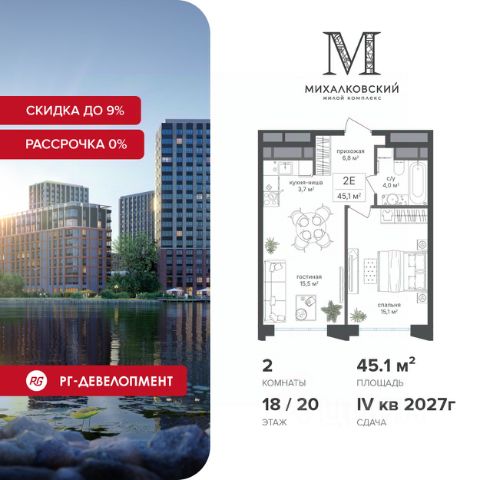 Ипотека для каждого! Полная стоимость кредита от 11,578% до 22,490%. Ставка от 0,11% в АО "Альфа-Банк" фиксируется на 1 год с даты заключения кредитного договора, далее полная стоимость кредита от 25,819% до 28,767% ставка 21,59% до окончания срока кредитования. Первоначальный взнос — от 20% от стоимости квартиры. Срок кредитования — от 3 до 30 лет. Скидка 9% при покупке квартиры! Продаётся 2-к квартира 43,5 кв.м. в ЖК "Михалковский" на 12-м этаже 18 этажного дома. Компания "РГ-Девелопмент" предоставляет скидки на квартиры в жилом комплексе. Акция действительна с 12.09.2024 г. до 30.11.25г. включительно. Для того чтобы воспользоваться предложением, необходимо подписать договор на приобретение недвижимости до 30.11.25г., включительно. Рассрочка 0% + Скидка 5%. При приобретении дольщиком квартиры в любом из двух данных корпусов с использованием способа оплаты "Рассрочка 0%", у покупателя также есть право воспользоваться скидкой в размере 5% от полной стоимости квартиры. Условия программы рассрочки: Первый платеж составляет 20% от стоимости объекта и вносится при заключении ДДУ. Второй платеж в размере 20% от стоимости объекта вносится по истечении 12 месяцев со дня подписания ДДУ. Оставшаяся сумма, в размере 60%, выплачивается за месяц до планового срока ввода ЖК в эксплуатацию, то есть не позднее 31.05.2027. Действует на приобретение квартир в корп. 2, 7. Действует программа "Растет семья - растет и квартира". Прямая продажа от застройщика! Старт продаж новых корпусов. Квартиры без отделки. Срок сдачи IV кв. 2027г. Особенности проекта: Завораживающие виды Красивое благоустройство Уникальная локация для Москвы (рядом Головинский парк, пруды, усадьба Михалково) Рядом с центром В проекте присутствует: архитектура голландского бюро MLA+, зеленые зоны, транспортная доступность, благоустроенная территория, подземный паркинг, детский сад и выход на Головинский парк с пятью прудами. Название комплекса указывает на одну из его черт - соседство с имением Михалково. Позвольте себе жить в месте, где проводили свой досуг династии Дашковых и Паниных.