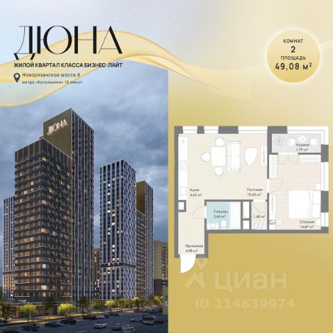 Современный жилой квартал бизнес-класса "Дюна" расположен в 10 минутах ходьбы от станции метро "Котельники" (1,2 км) на пересечении Новорязанского и Дзержинского шоссе. Квартал находится в районе с развитой инфраструктурой: в непосредственной близости расположены школы, детские сады, поликлиники, а также гипермаркеты и торговые комплексы, такие как "Metro", "Глобус", "Лемана Про" (Леруа Мерлен), "МЕГА Белая Дача", "Outlet Village Белая Дача" и другие. В шаговой доступности находятся физкультурно-оздоровительный комплекс с бассейном и теннисными кортами, а также благоустроенный лесопарк "Кузьминки" площадью 1189 га. Неподалёку расположены пляжи Дзержинских карьеров с экстрим-парком и горнолыжными трассами, Томилинский лесопарк с лыжной базой и Жулебинский лесопарк. Застройщик реализует современную урбанистическую концепцию "Город в городе", которая подразумевает наличие собственной полноценной инфраструктуры на территории жилого комплекса, включая школу, детские сады, торговую галерею, бизнес-центр, пункт полиции и медицинский центр. Общая площадь застройки составляет 12,2 га. Квартиры представлены в диапазоне планировок от студий до четырёхкомнатных, в обычном и евроформате. На этажах расположено от 3 до 4 бесшумных скоростных лифтов при количестве квартир от 4 до 7 на этаже. Квартиры сдаются с предчистовой отделкой (white box). Здания переменной этажности строятся по технологии монолит-кирпич, а фасады выполнены с использованием инновационной системы вентилируемого комбинированного фасада.Комфорт на внутренней территории обеспечивается за счёт принципа "двор без машин", системы доступа по карте и круглосуточного видеонаблюдения. Приобрести квартиру можно с использованием материнского капитала, беспроцентной рассрочки или ипотечных программ. При 100% оплате предусмотрены индивидуальные условия.