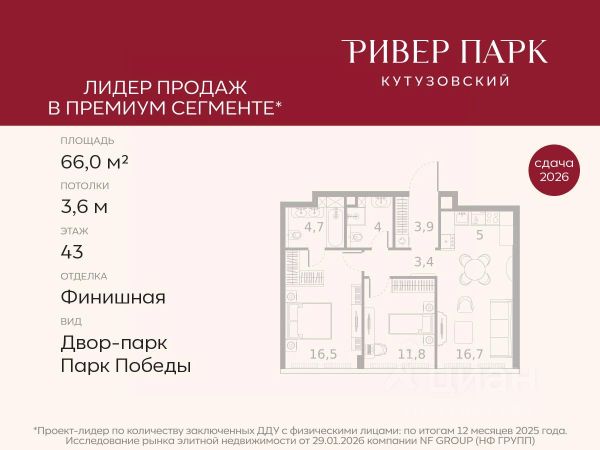 Продается 2-к квартира площадью 66.0 кв.м. на 43-м этаже в жилом комплексе премиум-класса Ривер Парк Кутузовский в Башне Топаз Премиальный жилой комплекс Ривер Парк Кутузовский строится в одном из самых престижных районов столицы Дорогомилово, на берегу Москвы-реки с лучшими видами на Москва-Сити. Яркий проект в стиле эко-футуризма станет самым масштабным и самым высотным ЖК в локации Кутузовского проспекта. Расположение и Транспортная доступность: • На берегу Москвы-реки, напротив Москва-Сити • 600 метров до Кутузовского проспекта • Удобный съезд с ТТК • Прямой выезд на МКАД по Проспекту Багратиона. • В пешей доступности 3 станции метро: Фили, Парк Победы, Кутузовская, а также станция МЦД Фили. Архитектура от именитого бюро ADM отличается уникальной пластикой фасадов - башни словно парят в воздухе, играя гранями как драгоценные камни. Жилой комплекс состоит из 5-ти небоскребов с приватным парком 2 Га и внешней торговой галереей с открытым доступом. В закрытом внутреннем дворе уникальная по насыщенности клубная инфраструктура только для жителей: • Площадка Мультиспорт (баскетбол, футбол, воллейбол, большой теннис) • Детский игровой клуб Немо • Музыкальная студия • Клуб Гедонист с бильярдной • Студия стиля для стилистов и массажа • Гольф-симулятор • Караоке Впервые в Москве лаунж-зоны на крыше небоскребов, только для жителей: • Всесезонные беседки иглу • Джакузи • Гриль • Площадка для занятий йогой • Самые высоки качели на крыше в России • Видовые площадки Благоустройство комплекса занимает 3 гектара и разработано мировым экспертом по городским парковым ландшафтам - голландским бюро WEST8. Концепция проекта дать жителям отдохнуть от городского ритма и расслабиться среди природы. В Приватном парке уже высажены хвойные деревья-крупномеры сосны и ели. • Зеркальный пруд с арт-объектом • Две детские площадки • Точка спорта с тренажерами и турниками • Цветущий сад • Зеленый театр со сценой и проектором • Видовая зона отдыха с очагом • Солнечная терраса с лежаками На территории жилого комплекса планируется строительство коммерческого образовательного центра, включающего детский сад на 200 мест и школу на 460 мест.