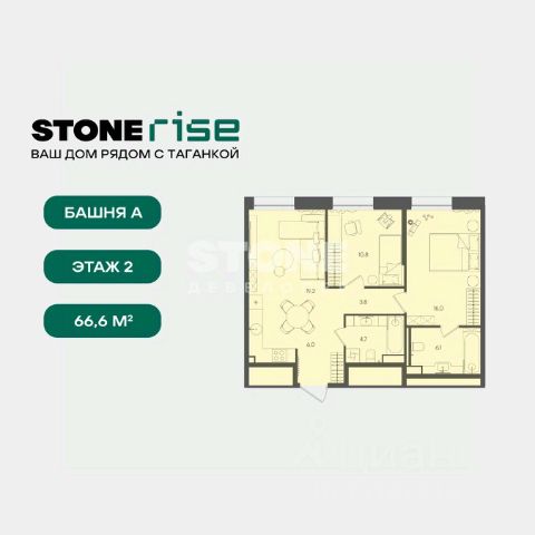 Старт продаж квартир в ЖК бизнес+ класса от девелопера STONE В продаже функциональная и светлая двуспальная квартира с кухней-гостиной, балконом и двумя спальнями для реализации любого дизайн-решения, идеально подходящая молодым парам, которые только планируют пополнение, а также небольшим семьям, где малыш уже подрастает. Квартира расположена в камерном низкоэтажном жилом комплексе бизнес+ в одной станции от кольца. STONE Rise находится в уникальной точке с быстрым доступом ко всем ключевым локациям Москвы. Жилой комплекс располагается на границе Таганского района в одной станции от Кольцевой линии метро и в 8 минутах от Садового кольца. Близость к ЦАО обеспечивает выезды на основные магистрали. В 3 минутах от комплекса располагается новый ТПУ Серп Молот, которые объединяет 2 линии метро и МЦД. - 3 мин. м. "Римская", "Площадь Ильича" - 3 мин ТПУ "Серп и Молот", МЦД-2, МЦД-4 - 2 станции на метро до ГЭС-2 и Третьяковки, до Чистых прудов и Сретенского бульвара по салатовой - 10 минут пешком до набережной Яузы и 20 минут до трех разных парков Архитектура Архитектурный проект разработан московским бюро WALL, известным работой над премиальными жилыми и офисными зданиями. Фасады домов выполнены из бетонной плитки серого и лого м изумрудного оттенков, а также металлических кассет. Вход в комплекс осуществляется через единое гранд-лобби. Здесь будут расположены кофейня, почты с локерами, а также комфортная гостиная с мягкой мебелью. В каждом корпусе расположены лаунж-зоны с естественным освещением в зоне лифтов. Благоустройство Территория комплекса полностью закрыта для машин и случайных посетителей. В центре - прогулочная аллея с дизайнерским освещением и местами для отдыха. В комплексе также обустроена площадка для выгула собак. Маршруты движения внутри двора продуманы для удобства пеших прогулок. Инфраструктура жилого комплекса На первых этажах комплекса расположены кафе, магазины, фитнес-студия и другие сервисные объекты. Двухуровневый подземный паркинг с возможностью выбора стандартных, увеличенных или семейных мест. Для удобства жителей предусмотрены лапомойки, келлеры, места для временного хранения велосипедов и самокатов. В STONE Rise также спроектировано многоуровневое пространство для жителей: - Бизнес-гостиная и детская-игровая, многофункциональное цифровое пространство - Благоустроенная общественная терраса с панорамными видами STONE - девелопер коммерческой и жилой недвижимости классов бизнес и премиум в Москве с 19-летним опытом. С 2022 года занимает лидирующую позицию на офисном рынке (рейтинг РБК). Сегодня в портфеле девелопера представлено 3 млн кв. м построенных, строящихся и проектируемых объектов, из которых более 1 млн кв. м находятся в стадии строительства. Компания имеет самый масштабный проектный портфель офисной недвижимости класса А на московском рынке (данные NF Group) и возглавляет топ-6 устойчивых девелоперов согласно исследованию F Research от Forbes. В 2023 году частью стратегии по развитию компании стала диве