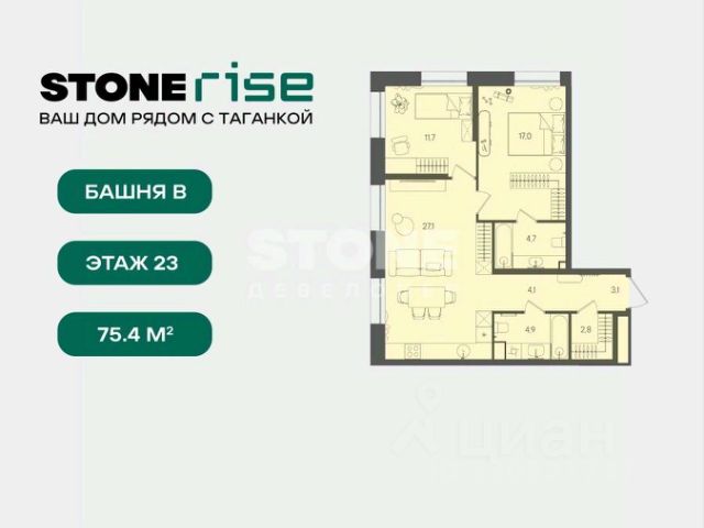 Старт продаж квартир в ЖК бизнес+ класса от девелопера STONE В продаже функциональная и светлая односпальная квартира с кухней-гостиной и одной спальней для реализации любого дизайн-решения, идеально подходящая молодым парам и небольшим семьям. Квартира расположена в камерном низкоэтажном жилом комплексе бизнес+ в одной станции от кольца. STONE Rise находится в уникальной точке с быстрым доступом ко всем ключевым локациям Москвы. Жилой комплекс располагается на границе Таганского района в одной станции от Кольцевой линии метро и в 8 минутах от Садового кольца. Близость к ЦАО обеспечивает выезды на основные магистрали. В 3 минутах от комплекса располагается новый ТПУ Серп Молот, которые объединяет 2 линии метро и МЦД. - 3 мин. м. "Римская", "Площадь Ильича" - 3 мин ТПУ "Серп и Молот", МЦД-2, МЦД-4 - 2 станции на метро до ГЭС-2 и Третьяковки, до Чистых прудов и Сретенского бульвара по салатовой - 10 минут пешком до набережной Яузы и 20 минут до трех разных парков. Архитектура Архитектурный проект разработан московским бюро WALL, известным работой над премиальными жилыми и офисными зданиями. Фасады домов выполнены из бетонной плитки серого и лого м изумрудного оттенков, а также металлических кассет. Вход в комплекс осуществляется через единое гранд-лобби. Здесь будут расположены кофейня, почты с локерами, а также комфортная гостиная с мягкой мебелью. В каждом корпусе расположены лаунж-зоны с естественным освещением в зоне лифтов. Благоустройство Территория комплекса полностью закрыта для машин и случайных посетителей. В центре - прогулочная аллея с дизайнерским освещением и местами для отдыха. В комплексе также обустроена площадка для выгула собак. Маршруты движения внутри двора продуманы для удобства пеших прогулок. Инфраструктура жилого комплекса На первых этажах комплекса расположены кафе, магазины, фитнес-студия и другие сервисные объекты. Двухуровневый подземный паркинг с возможностью выбора стандартных, увеличенных или семейных мест. Для удобства жителей предусмотрены лапомойки, келлеры, места для временного хранения велосипедов и самокатов. В STONE Rise также спроектировано многоуровневое пространство для жителей: - Бизнес-гостиная и детская-игровая, многофункциональное цифровое пространство - Благоустроенная общественная терраса с панорамными видами STONE - девелопер коммерческой и жилой недвижимости классов бизнес и премиум в Москве с 19-летним опытом. С 2022 года занимает лидирующую позицию на офисном рынке (рейтинг РБК). Сегодня в портфеле девелопера представлено 3 млн кв. м построенных, строящихся и проектируемых объектов, из которых более 1 млн кв. м находятся в стадии строительства. Компания имеет самый масштабный проектный портфель офисной недвижимости класса А на московском рынке (данные NF Group) и возглавляет топ-6 устойчивых девелоперов согласно исследованию F Research от Forbes. В 2023 году частью стратегии по развитию компании стала диверсификация портфеля, в результате которой девелопер провел ребрендинг и запусти