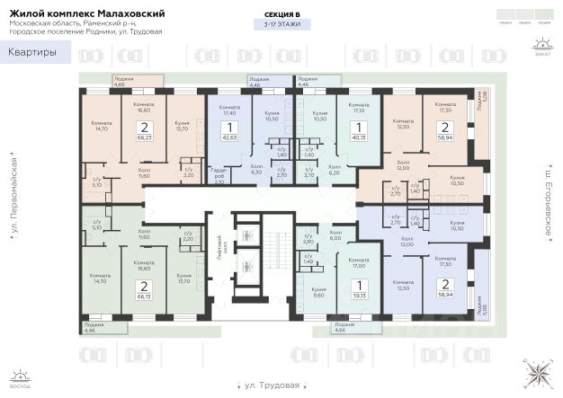 Продается 2-к квартира площадью 63.9 кв. м без отделки. Квартира расположена на 2 этаже 17 этажного дома, в 203 корпусе. "Малаховский" - жилой комплекс в Раменском районе Подмосковья, идеально подходящий для семей с детьми. Проект от федерального застройщика ГК "Развитие" находится в тихом и зеленом микрорайоне Родники и отличается удобной транспортной связью с Москвой и Люберцами. Три дома высотой 17 этажей с видами на озеро и парк, просторные квартиры, приватный двор-патио с ландшафтным дизайном и доступная инфраструктура обеспечат жителям новых квартир все преимущества городской жизни в живописном природном окружении. Транспортная доступность - Удобный выезд на Егорьевское шоссе и строящуюся магистраль МЕТК (Москва - Егорьевск - Тума - Касимов); - 18 км от МКАД; - 5 мин. до МЦД-3 "Удельная"; - 29 мин. до метро "Лермонтовский проспект". Архитектура Дома отличаются высокой тепло- и шумоизоляцией, долговечностью, высоким уровнем энергоэффективности и современным внешним видом. Фасады выполнены в спокойной цветовой гамме. Из окон с широкоформатным остеклением открываются виды на березовую рощу, озеро и зеленые дворы. Логичным продолжением архитектуры становятся просторные входные группы, где продумано всё: витражное остекление, высокие потолки, дизайнерская отделка, два выхода на обе стороны дома, а также современные лифты (грузовой и пассажирский) и колясочные. Планировочные решения Планировки комплекса "Малаховский" функциональны и эргономичны, что упрощает зонирование и расстановку мебели. Квартиры оснащены гардеробными, лоджиями с панорамным остеклением, двумя санузлами (даже в однокомнатных) и просторными прихожими. Высота потолков - 2,7 м. Квартиры сдаются с отделкой white box, которая позволит воплотить индивидуальный дизайн-проект по своему вкусу. Доступны варианты отделки "под ключ" с применением лучших дизайнерских материалов. Благоустройство В жилом комплексе тщательно продумана концепция благоустройства. Через всю территорию тянутся живописные прогулочные бульвары с ландшафтным дизайном и всесезонным озеленением. Рядом обустроено 3 современных детских площадки с мягким покрытием, а для взрослых предусмотрены уютные лаунж-зоны для общения, тихого отдыха и спорта на свежем воздухе. Двор каждого дома свободен от машин, а для дополнительного уюта и безопасности здесь установлено современное освещение. Естественным продолжением дворового ландшафта становится березовая роща с природными тропинками и небольшим водоемом, прилегающая к жилому комплексу. Инфраструктура и окружение - Наземный паркинг на 55 машино-мест и гостевая парковка; - Все повседневные сервисы (кафе, магазины, салоны красоты) прямо в вашем доме; - Фитнес-клуб, бассейн, спортивные площадки и велодорожки в многочисленных парках микрорайона Родники; - 2 школы, гимназия и детский сад в шаговой доступности; - ТЦ "Родники" с рестораном и супермаркетом; - Петропавловский парк с благоустроенным детским городком и волейбольной площадкой;