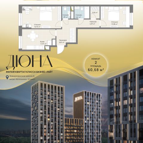 Современный жилой квартал бизнес-класса "Дюна" расположен в 10 минутах ходьбы от станции метро "Котельники" (1,2 км) на пересечении Новорязанского и Дзержинского шоссе. Квартал находится в районе с развитой инфраструктурой: в непосредственной близости расположены школы, детские сады, поликлиники, а также гипермаркеты и торговые комплексы, такие как "Metro", "Глобус", "Лемана Про" (Леруа Мерлен), "МЕГА Белая Дача", "Outlet Village Белая Дача" и другие. В шаговой доступности находятся физкультурно-оздоровительный комплекс с бассейном и теннисными кортами, а также благоустроенный лесопарк "Кузьминки" площадью 1189 га. Неподалёку расположены пляжи Дзержинских карьеров с экстрим-парком и горнолыжными трассами, Томилинский лесопарк с лыжной базой и Жулебинский лесопарк. Застройщик реализует современную урбанистическую концепцию "Город в городе", которая подразумевает наличие собственной полноценной инфраструктуры на территории жилого комплекса, включая школу, детские сады, торговую галерею, бизнес-центр, пункт полиции и медицинский центр. Общая площадь застройки составляет 12,2 га. Квартиры представлены в диапазоне планировок от студий до четырёхкомнатных, в обычном и евроформате. На этажах расположено от 3 до 4 бесшумных скоростных лифтов при количестве квартир от 4 до 7 на этаже. Квартиры сдаются с предчистовой отделкой (white box). Здания переменной этажности строятся по технологии монолит-кирпич, а фасады выполнены с использованием инновационной системы вентилируемого комбинированного фасада.Комфорт на внутренней территории обеспечивается за счёт принципа "двор без машин", системы доступа по карте и круглосуточного видеонаблюдения. Приобрести квартиру можно с использованием материнского капитала, беспроцентной рассрочки или ипотечных программ. При 100% оплате предусмотрены индивидуальные условия.