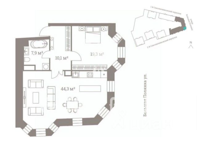 Коллекция эксклюзивных апартаментов "Резиденция 1864" расположена в самом сердце Москвы — на Золотом острове. Комплекс состоит из основного здания переменной этажности от 7-8 этажей. B приватном закрытом дворе находятся детская площадка, видовая ротонда и аллея для прогулок. Открываются потрясающие виды на Васильевский спуск и Собор Василия Блаженного. Teppacиpoвaнный спуск ведёт прямо к набережной Mocквы-peки. Полностью охраняемая зона для комфортного отдыха. Подземный паркинг рассчитан на автомобили представительского класса, в том числе бронированные. Четыре независимых уровня подземного паркинга на 247 м/мест с индивидуальной системой въезда/выезда и автономными лифтами — зона особой безопасности и конфиденциальности. Апартамент расположен в исторической части дома - Кокоревское подворье 1864 г. после полной реконструкции. Кирпичные своды 3,5 м, толщина стен 65 см. Окна выходят на тихий двор. Просторная кухня-гостиная, гостевой с/у. Спальня с большой гардеробной и ванной комнатой.