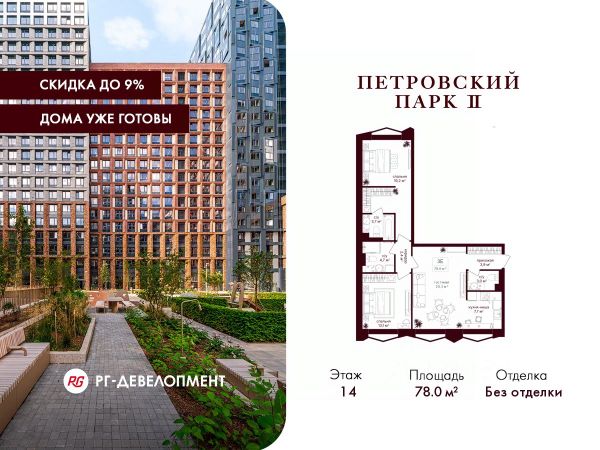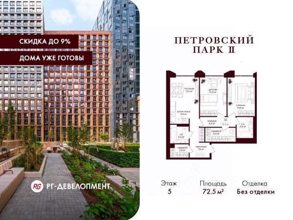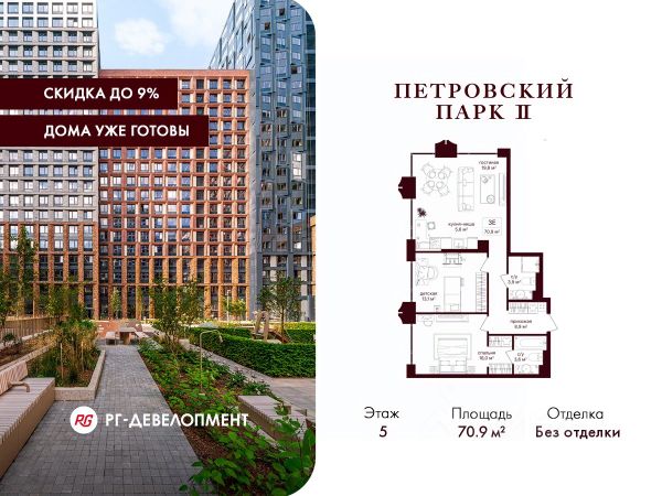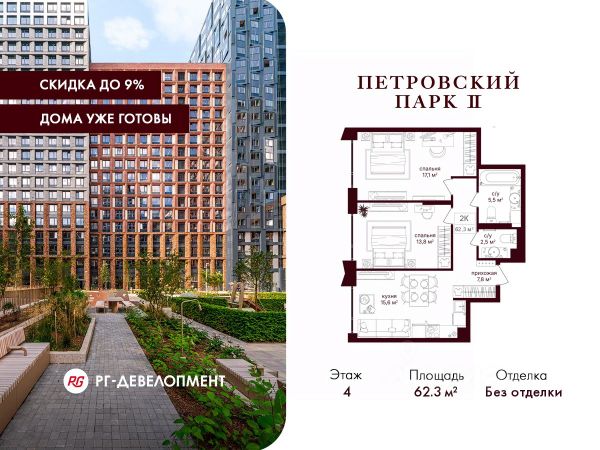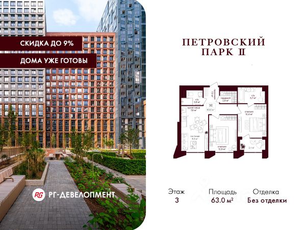 Продаётся 2-комнатная квартира 67,4 кв.м. в ЖК "Петровский парк II" на 5-м этаже 24 этажного дома. Скидка 9% при покупке квартиры! Цена указана с учетом максимального размера скидки. Компания "РГ-Девелопмент" предоставляет скидки на квартиры в жилом комплексе. Акция действительна с 01.11.2025г. до 30.11.2025г. включительно. Для того чтобы воспользоваться предложением, необходимо подписать договор на приобретение недвижимости до 30.11.2025г., включительно. ЖК "Петровский парк II" расположен в историческом районе Москвы, в 5 минутах от парка и станции метро "Динамо". Архитектуру от Syntaxis характеризуют асимметричные фасады, геометрические выступы, напоминающие волны. Эстетика архитектурных форм продолжается в интерьере внутренних пространств - двух центральных лобби и входных группах. На закрытой территории зеленые зоны с цветниками, места для отдыха, спортивные и игровые площадки. Подземная парковка, близость основных магистралей и удобные выезды, которые дают возможность жителям комплекса быть в центре культурной и общественной жизни. Комфортной жизни на территории комплекса расположены магазины, рестораны, частный детский сад.