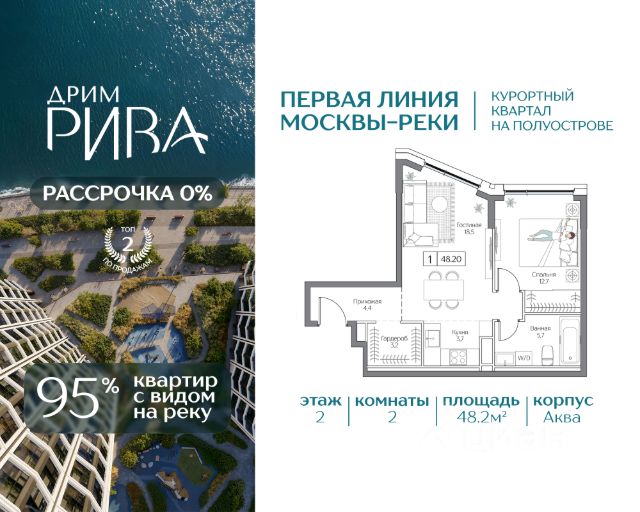 Квартира в премиальном квартале Dream Riva — первая линия Москвы-реки Продается квартира в прибрежном квартале Dream Riva на территории курортной локации "Остров мечты". 46.6 кв.м, 2 комнат, 2 этаж. Высота потолков 3,1 м. • 95% квартир Жемчужной коллекции смотрят на воду • Мастер-спальня с гардеробной • Естественный свет в гостиной с двух сторон ЛОКАЦИЯ И ТРАНСПОРТ • 15 минут на авто до Садового кольца, • 30 минут до Москва-Сити и Кремля. • 10 минут до метро "Технопарк" в пешей доступности. В перспективе — станция "Остров мечты" (2028г.). ИНФРАСТРУКТУРА КВАРТАЛА • 3 Га приватного двор-парка с зонами для спорта, йоги и отдыха; • Благоустроенная набережная с гастропроменадом; • Клубные лобби с инфраструктурой; • Премиум SPA-центр с бассейном и фитнес-клуб; • Государственный детский сад под окном и школа в 10 минутах от квартала; • Подземный и гостевой паркинг. ПРИВИЛЕГИИ РЕЗИДЕНТОВ • Пляжный клуб Dream Beach Club; • Яхт-клуб Dream Marine Resort; • Вейк-клуб; • Парк развлечений "Остров мечты"; • 44 Га парков для прогулок и спорта в окружении квартала. БЕЗОПАСНОСТЬ И КОМФОРТ • Приватная территория; • Охрана; • Видеонаблюдение; • Консьерж-сервис 24/7; • Современные инженерные системы и технологии умного дома. НАДЕЖНЫЙ ЗАСТРОЙЩИК Regions Development — успешная девелоперская компания. За 20 лет работы реализовали уже более 30 проектов в сегментах коммерческой и многофункциональной недвижимости. Скидки действуют только при 100% оплате и ипотеке Скидки действуют только при 100% оплате, ипотеке и рассрочке. Скидки и акции не суммируются. Звоните, чтобы договориться о просмотре!