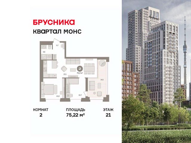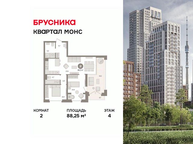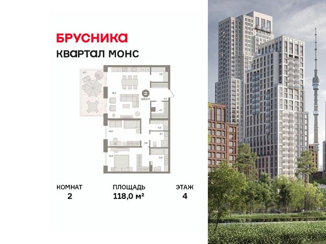 Квартира с кухней-гостиной и двумя спальнями в квартале "МОНС". Особенности планировки: окна на две стороны, окна в пол, панорамное остекление, разнесённые спальни, предчистовая отделка, терраса, терраса на крыше. Квартиру можно купить онлайн. В квартире выполнена отделка "под чистовую". Установлены окна с двойным стеклопакетом, радиаторы с терморегуляторами. На полу цементно-песчаная стяжка. В квартиры заведены кабели для интернета и ТВ. Входная сейф-дверь не требует замены. Организован поквартирный учёт энергоресурсов (водоснабжение, отопление, электричество). Квартал "МОНС" пронизан атмосферой локации, её энергетикой. Она воплощена в общей композиции, чистоте её форм, в графичных и динамичных силуэтных линиях. Пять домов от 2 до 45 этажеи поддерживают идею монументальности и одновременной лёгкости, но при этом у каждого из них сформировался свой характер. "Игра" с разными высотами, текстурой и формой фасадов позволила запустить в квартиры и дворы больше света, сделать пространства между домами проницаемыми и воздушными. Застройщик — компания Брусника. Инфраструктура квартала "МОНС" включает детское образовательное учреждение, магазины, предприятия услуг и офисные помещения. В шаговой доступности находятся: парки ВДНХ и Останкино, школа и детский сад, супермаркеты Перекресток и Вкусвилл, фитнес-клубы, студии растяжки и йоги. Объявление от застройщика. Ипотека, материнский капитал. Обмен — один из способов покупки. Обмен подойдёт, если вы хотите быстро поменять старую квартиру на новую. Получить ипотеку или рассрочку, а также обменять квартиру можно онлайн. Запишитесь на онлайн-презентацию по телефону или на сайте. квартиры в нашей базе: МОН01-Ж4.23.7.