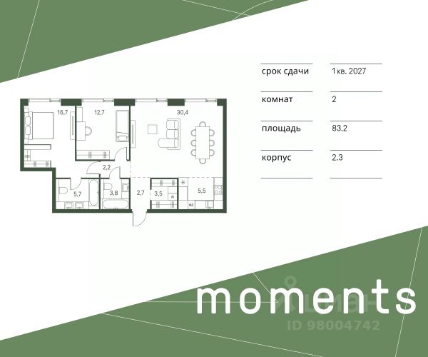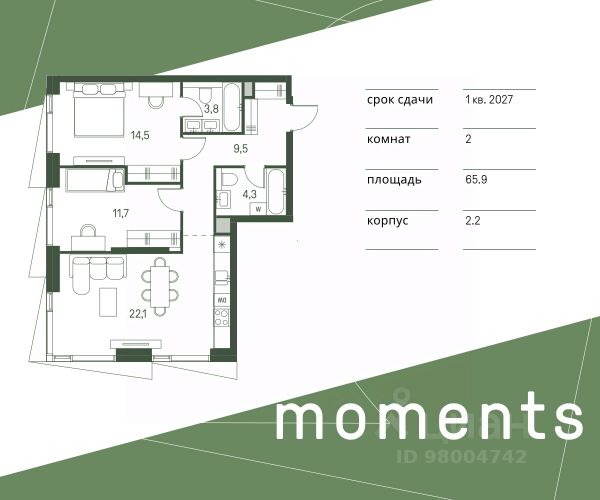 Цены указаны с условием 100% оплаты и стандартной ипотеки. Продается 2-к. квартира номер 1147 общей площадью 56.7 кв.м. на 20-м этаже 34 этажного дома, корпус 2.2. С отделкой White Box. Moments — ЖК бизнес-класса, расположен на расстоянии вытянутой руки от старинного усадебного парка Покровское-Стрешнево. Moments — это единение города и природы, дом, который помогает обрести гармонию и баланс в жизни. Moments расположен на Волоколамском шоссе с удобным выездом в центр и в область, а также с расположенными в пешей доступности объектами транспортной инфраструктуры (МЦК и МЦД-2). Жилой комплекс будет состоять из 3 очередей — 8 корпусов высотой от 4 до 47 этажей. Здания будут расположены под разными углами для максимальной открытости солнцу и максимально роскошным видовым характеристикам. Внутренний двор: Иммерсивное благоустройство от британского бюро Gillespies и West8 сфокусировано на эмоциональном и чувственном опыте. Каждая прогулка по Moments погружает в путешествие со сменой сценариев и плавным потоком уникальных моментов. - Пешеходная экотропа,которая соединяет комплекс с парком Покровское-Стрешнево - Двор с фонтаном - Зеленые сады и лаунж-зоны - Пространства для пикников и общения - Зоны активного отдыха. Детские и спортивные площадки - Пешеходные тропы и велодорожки - Разнообразная коммерческая инфраструктура - Детский сад на 175 мест - Школа на 300 мест - Игровые площадки из натуральных материалов - Сенсорные сады - Безбарьерное зонирование