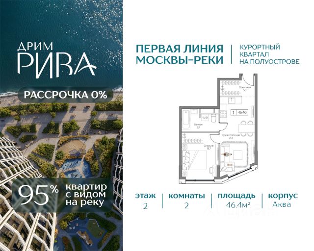 Квартира в премиальном квартале Dream Riva — первая линия Москвы-реки Продается квартира в прибрежном квартале Dream Riva на территории курортной локации "Остров мечты". 46.6 кв.м, 2 комнат, 2 этаж. Высота потолков 3,1 м. • 95% квартир Жемчужной коллекции смотрят на воду • Мастер-спальня с гардеробной • Естественный свет в гостиной с двух сторон ЛОКАЦИЯ И ТРАНСПОРТ • 15 минут на авто до Садового кольца, • 30 минут до Москва-Сити и Кремля. • 10 минут до метро "Технопарк" в пешей доступности. В перспективе — станция "Остров мечты" (2028г.). ИНФРАСТРУКТУРА КВАРТАЛА • 3 Га приватного двор-парка с зонами для спорта, йоги и отдыха; • Благоустроенная набережная с гастропроменадом; • Клубные лобби с инфраструктурой; • Премиум SPA-центр с бассейном и фитнес-клуб; • Государственный детский сад под окном и школа в 10 минутах от квартала; • Подземный и гостевой паркинг. ПРИВИЛЕГИИ РЕЗИДЕНТОВ • Пляжный клуб Dream Beach Club; • Яхт-клуб Dream Marine Resort; • Вейк-клуб; • Парк развлечений "Остров мечты"; • 44 Га парков для прогулок и спорта в окружении квартала. БЕЗОПАСНОСТЬ И КОМФОРТ • Приватная территория; • Охрана; • Видеонаблюдение; • Консьерж-сервис 24/7; • Современные инженерные системы и технологии умного дома. НАДЕЖНЫЙ ЗАСТРОЙЩИК Regions Development — успешная девелоперская компания. За 20 лет работы реализовали уже более 30 проектов в сегментах коммерческой и многофункциональной недвижимости. Скидки действуют только при 100% оплате и ипотеке Скидки действуют только при 100% оплате, ипотеке и рассрочке. Скидки и акции не суммируются. Звоните, чтобы договориться о просмотре!