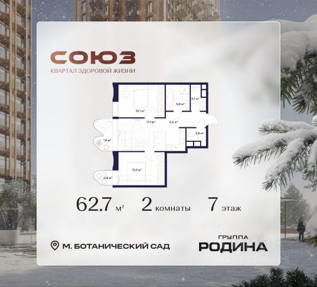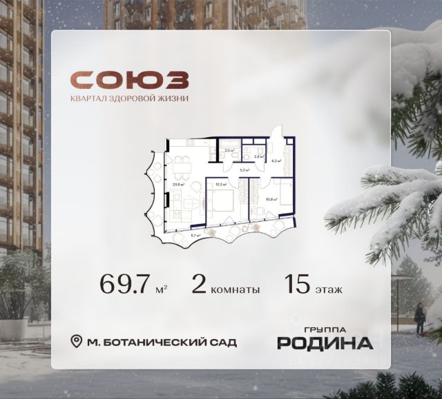 Готовые дома и ключи в день покупки Рассрочка 0% Продаётся 2-комнатная квартира площадью 61.4 м² на 2 этаже в Жилом Комплексе "Союз". Квартал здоровой жизни премиум-класса с рекордным количеством олимпийских видов спорта: - Ледовая арена для хоккея и фигурного катания, - Футбольные поля для тренировок, - Спортивный зал для фехтования, - Бассейн на 6 дорожек, - Центр единоборств, - 4 крытых площадки для настольного тенниса, - 7 теннисных кортов (крытых и открытых), - 4 крытых площадки для сквоша, - Легкоатлетический стадион, - Площадки для баскетбола и волейбола. Уникальные форматы квартир с мастер-спальнями, приватными террасами, балконами, а также пентхаусы с открыточными видами на город. Все квартиры продаются с отделкой Shell&Core и панорамным остеклением. Расположение Пешком: - 2 мин. до парка "Сад Будущего"; - 6 мин. до ст. м. "Ботанический сад"; - 6 мин. до ст. МЦК "Ботанический сад"; - 6 мин. до парка "Леоновская роща"; На автомобиле: - 2 мин. до СВХ (МСД); - 5 мин. до Проспекта Мира; - 10 мин. до ТТК; - 15 мин. до Садового кольца; - 25 мин. до аэропорта "Шереметьево". Благоустройство - собственная спортивная инфраструктура 7 Га; - зона для пикников; - игровые и спортивные площадки для детей всех возрастов; - розарий, а также сосновые, каштановые и дубовые аллеи; - площадки под открытым небом для занятий спортом и йоги; - игровые комнаты для детей; - лаунж-зона для резидентов; - просторная переговорная для деловых встреч; - премиальный ресторан "Шабада" Сосо Павлиашвили с водными арт-объектами на прогулочной аллее, садом ароматных трав и сценой под открытым небом; - кафе, химчистки, аптеки и супермаркеты рядом с домом. Окружение - 8 парков: Сад Будущего, Леоновская роща, Хуамин, Главный ботанический сад РАН, Шереметьевская дубрава, Останкино, парк спорта "Яуза", пойма реки Яуза и музей-усадьба "Останкино"; - 3 ВУЗа: ВГИК, РГСУ, МГПУ; - 12 школ, в том числе: школа 1499 им. И.А. Докукина (топ 100), Brookes Moscow, IThub школа; - 18 детских садов, в том числе билингвальный ALERTUM KIDS; - один из крупнейших океанариумов Европы "Москвариум"; - один из крупнейших в Европе торгово-развлекательных центров "Европолис".