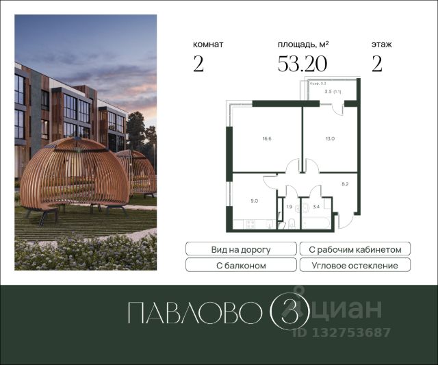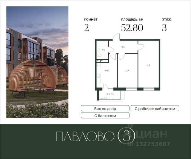 Старт продаж! Продается 2-комнатная квартира в новом клубном жилом комплексе "Павлово 3" площадью - 52.30 кв. м на 1 этаже, в корпусе 2 в малоэтажном монолитном доме от компании-застройщика. Квартира с угловым остеклением. Из окон, открывается отличный вид. В квартире предусмотрен отдельный рабочий кабинет. В квартире высокие потолки 3.4 м, что дает ощущение простора. Преимуществом также является большой санузел. "Павлово 3" - премиальный уровень комфорта загородной жизни в бизнес-классе. Выбирайте камерный квартал, он станет лучшим домом для каждого, кто ценит приватность и комфорт. Срок сдачи - 2 квартал 2027. Более подробная информация по телефону. Особенности комплекса: • Высота потолков в каждой квартире - от 3 метров; • Собственный детский сад; • Авторская концепция озеленения; • МЦД-2 "Нахабино" в 5 минутах езды; • Садовое кольцо в 35 минутах езды • Локация с насыщенной инфраструктурой столичного уровня: торговые центры, кафе, рестораны, учебные заведения, развлекательные и спортивные объекты. Расположение Клубный жилой комплекс бизнес-класса "Павлово 3" возводится в экологически чистом районе престижного северо-западного направления Москвы. Здесь природа и атмосфера спокойствия соседствуют с комфортом современного мегаполиса. 7 трехэтажных корпусов, выполненных в едином современном стиле, формируют уютную камерную атмосферу. Архитектура На первых этажах домов - просторные и функциональные входные группы, где предусмотрено все: мягкий интерьер в природных тонах, дизайнерская отделка натуральным деревом и камнем, панорамные окна с видом на лес, помещения для хранения колясок и спортивного инвентаря, а также специальные подъемники для маломобильных жителей. Благоустройство "Павлово 3" - это 6 га приватной охраняемой территории, 2 км прогулочных дорожек вдоль леса, 19 зон для тихого и активного отдыха и 3963 деревьев и цветущих кустарников, высаженных непосредственно на территории комплекса. Чтобы оказаться наедине с природой теперь достаточно пары минут пешком. Для жителей "Павлово 3" создан собственный выход в лес, благоустроены лаунж-зоны на свежем воздухе и гармонично вписаны в ландшафт ливневые сады. Здесь же появится барбекю-зона для уютных вечеров в кругу семьи и друзей. Инфраструктура Жителям доступна инфраструктура престижного района с известными ресторанами, спортивными клубами и рейтинговыми учебными заведениями. На территории клубного дома детям не придется скучать. В их распоряжении - 16 игровых площадок с инвентарем из природных безопасных материалов. А для поддержания здорового образа жизни предусмотрено 5 спортивных зон, включая воркаут-тренажеры, корты для мини-футбола, волейбола, падел-тенниса и баскетбола. Для гостей предусмотрен свой паркинг, а для владельцев электромобилей - зарядные станции. Количество машиномест равно количеству квартир. Вся территория оснащена системами безопасности и камерами видеонаблюдения, работает WI-FI.