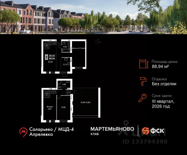 Прямая продажа от застройщика! Жилой Комплекс класса Комфорт. Продаётся 2-к квартира 41 общей площадью 88.94 кв.м на 3-м этаже 3 этажного дома. Без отделки. Расположение комплекса: "Мартемьяново Клаб" - клубный поселок таунхаусов от ФСК в Наро-Фоминском городском округе. Счастливая жизнь складывается из плюсов двух миров: городского и загородного. Вы наслаждаетесь свежим воздухом, лесными пейзажами вокруг и отдыхом у собственного пруда. При этом пользуетесь комфортной инфраструктурой, всеми центральными коммуникациями, собственной современной школой и детским садом. Закрытая охраняемая территория дарит вам чувство спокойствия и безопасности. А заказать все услуги возможно через мобильное приложение управляющей компании. Выбираться во внешний мир легко благодаря хорошей транспортной доступности. Транспортная доступность: "Мартемьяново Клаб" расположился в экологичном районе в 27 км от МКАД по Киевскому шоссе. Выбирайте любимую аудиокнигу, и уже через пару глав вы окажетесь в Москве. Добираться в город можно как на личном авто, так и на общественном транспорте до станций метро "Саларьево" и "Внуково". Авитомобиль: До Киевского шоссе - 4 минуты До МКАД - 25 минут До ТТК - 45 минут До Садового кольца - 50 минут Общественный транспорт: До станции метро "Саларьево" - 25 минут До станции МЦД4 "Апрелевка" - 10 минут До остановок общественного транспорта - 8 минут пешком Внутренняя инфраструктура: Сердце поселка - живописный пруд. У пруда расположен собственный пляж. Здесь так приятно проводить жаркие летние дни. А в зимние холода гладь пруда превращается в веселый каток. И, поверьте, дарит не меньше счастья. У пруда берет начало главная пешеходная артерия поселка - прогулочный бульвар длиною 1,8 км. Он ведет в лесную зону с ручьем и сам напоминает реку, только сухопутную. 3,3 га парковой зоны наполняют окружающее пространство энергией динамичных зон, которые сменяются зонами спокойствия. У бульвара есть "притоки" - второстепенные пешеходные улочки с площадками для игр и тихого отдыха. Круглая центральная площадь - место встречи и знакомства с соседями. Здесь круглый год проводят всевозможные культурные мероприятия, отмечают праздники, устраивают ярмарки или тематические гараж-сейлы. Рядом располагаются качели, лабиринт, детские площадки и кафе. Это позволяет каждому найти занятие по душе. Продается 2-комнатная квартира в городском округе Наро-Фоминском Московской области.