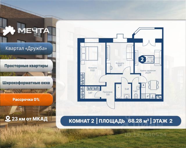 Рассрочка 0% от застройщика! Продается двухкомнатная квартира в квартале "Дружба" жилого комплекса "Мечта". Общая площадь квартиры: 59.54 кв. м, этаж 5 из 5. Срок сдачи: 4 квартал 2027 г. Отделка: Чернова ОСОБЕННОСТИ: - Просторная кухня-гостиная - Продуманная планировка - Широкоформатные окна - 2 спальни - 2 санузла - Высота потолка: 2.7 метра Квартал "Дружба" состоит из пяти пятиэтажных домов с несколькими подъездами. Каждый дом оборудован широкими окнами, которые обеспечивают максимальный доступ естественного света и открывают прекрасный вид на окружающую природу. Квартал отличается большими застеклёнными лоджиями, которые позволяют наслаждаться свежим воздухом и красивым видом, не покидая своего жилища. Жилой комплекс "Мечта" расположен в 23 км от МКАД по Дмитровскому или Ленинградскому шоссе. ТРАНСПОРТНАЯ ДОСТУПНОСТЬ: - 15-20 минут на общественном транспорте до МЦД-1 "Лобня" - 30-35 минут на общественном транспорте до метро "Физтех" - 45-50 минут до станций метро "Савеловская" или "Белорусская" - 30 минут на автомобиле до Москвы Инфраструктура включает в себя муниципальную школу и детские сады, кабинет врача общей практики, множество кафе и ресторанов, а также различные спортивные и детские площадки. В пешей доступности от жилого комплекса расположены лес и три реликтовых озера — Долгое, Круглое и Нерское, а также реки Альба, Уча и Волгуша. Территория жилого комплекса закрыта для посторонних, находится под охраной и патрулируется. На въезде расположен КПП. Камеры видеонаблюдения работают круглосуточно на всей территории. Вы и ваши дети будете чувствовать себя в безопасности. Продам 2-комнатную квартиру Рогачевское шоссе.