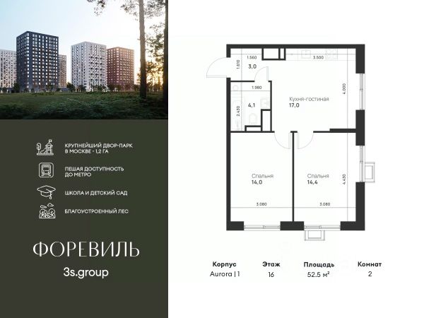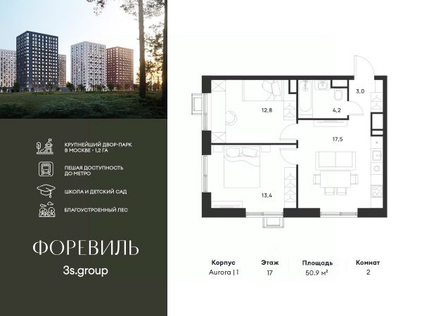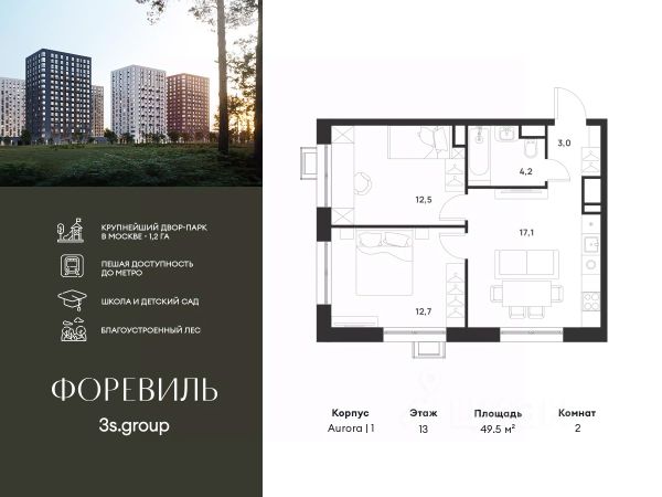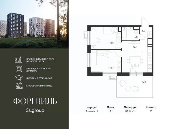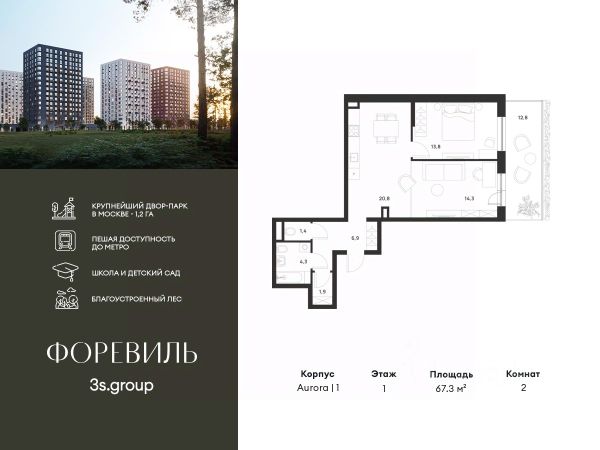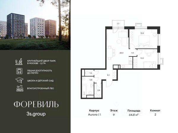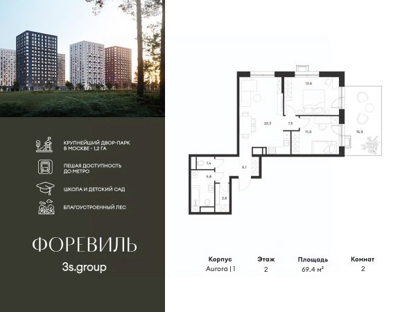 Пешая доступность от метро и московская прописка! Продается уютная 2-комн. квартира площадью 65,8 кв.м на 16 этаже 17 этажного жилого комплекса бизнес-класса Foreville от 3S Group. Общая площадь: 65,8 кв.м., жилая: 41,3 кв.м., площадь кухни-гостиной: 22,7 кв.м., высота потолков: 3 м., окна выходят во двор и на улицу. Квартира предлагается без отделки, что идеально подходит для воплощения собственного дизайнерского решения. Также доступна опция предчистовой отделки, стоимость которой включается в общую цену квартиры. О проекте: Пространство Комплекс располагает крупнейшим приватным двор-парком в Новой Москве площадью 1,2 Га, предлагая жителям огромное пространство для отдыха, спорта и игр на свежем воздухе. Природный ландшафт Внутренний лесопарк с более чем 183 взрослыми деревьями и 10 320 цветущими кустарниками создает уникальную природную атмосферу для каждого времени года. Игровые и спортивные зоны Обширные площадки с безопасным покрытием, специализированные зоны для детей разных возрастных групп и взрослых, включая воркаут и настольный теннис, способствуют активному и здоровому образу жизни. Экологичность и долговечность Использование натуральных материалов, таких как лиственница, и крупноформатной бетонной плитки для покрытия, подчеркивает стремление проекта к экологичности и устойчивости. Безопасность и уединение Внутренний двор без машин обеспечивает безопасность для детей и спокойствие для взрослых. Территория огорожена и находится под круглосуточным видеонаблюдением. Сохранение времени Благодаря превосходной транспортной доступности и близости к новой станции метро Корниловская, Foreville позволяет жителям экономить время для семьи и отдыха на природе, минимизируя необходимость длительных поездок. Foreville не просто жилье, а целая экосистема для комфортной и гармоничной жизни на свежем воздухе, совмещая преимущества городской инфраструктуры и непосредственную близость к природе.