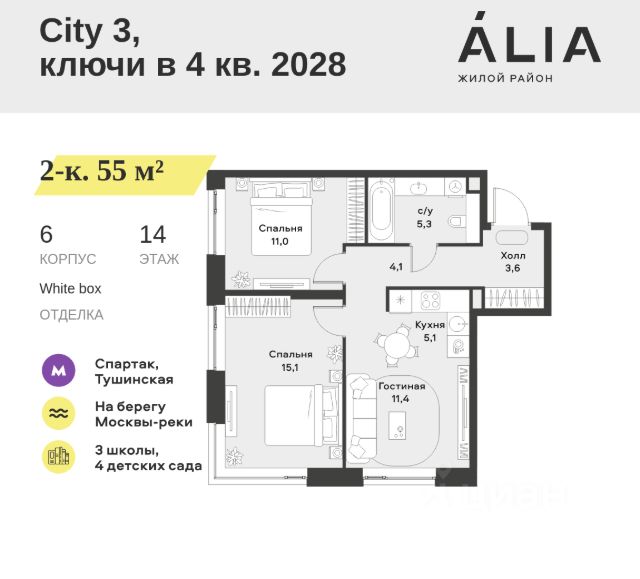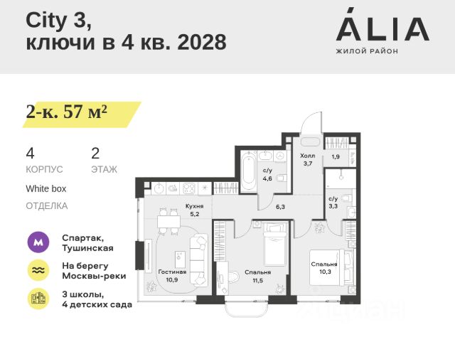 Продаётся 2-комнатная квартира 57 м². В жилом районе ALIA на 2-м этаже 18-этажного дома. Жилой район ALIA — это дома бизнес-класса у слияния Москвы-реки и Сходни. ALIA находится в Покровском-Стрешневе, экологически чистом районе на престижном северо-западе столицы. Район возводится на бывшей территории Тушинского аэрополя, где никогда не было промышленного производства. ALIA — это район разностороннего развития, спроектированный по принципу WORK.LIVE.PLAY.LEARN. Это "15-минутный город", где вся необходимая для комфортной жизни инфраструктура — на расстоянии приятной прогулки. У района удобное расположение: отсюда меньше 10 минут пешком до станций метро "Спартак" и "Тушинская" и всего полчаса на автомобиле до центра города или аэропорта Шереметьево. Архитектурную концепцию ALIA разработало бюро SOM (Skidmore, Owings & Merrill), авторы знаменитой "Бурдж-Халифа". В ALIA больше 140 планировочных решений, среди которых — редкие для Москвы форматы: квартиры с окном в ванной, пентхаус, сити-юниты и таунхаусы. Почти половина территории района отдана под благоустройство. В ALIA три парка: Линейный парк с кафе и магазинами, Центральный парк с амфитеатром, сухим фонтаном и большим плейхабом для детей всех возрастов и Прибрежный парк на собственной набережной, одной из самых длинных в Москве. В каждом урбан-блоке — закрытый внутренний двор с гипоаллергенными растениями и детской площадкой. В лобби каждого жилого корпуса в ALIA оборудована зона ожидания, колясочная, гостевой санузел и лапомойка для домашних животных. За стойкой ресепшена резидентов и их гостей встречает консьерж. Центральное лобби урбан-блока — это стильное общественное пространство с коворкингом, лаундж-зоной и кофе-пойнтом. Это "вторая гостиная" жителей урбан-блока и одно из мест, где формируется комьюнити ALIA. Два ключевых объекта инфраструктуры в ALIA — это спорткомплекс "Чкалов Арена", где представлены 25 видов спорта, и самый большой в стране бизнес-парк класса A, благодаря которому району обеспечено быстрое развитие.