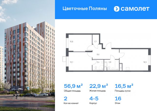 Строим кварталы для жизни с заботой о будущем. Предлагается 2-комнатная квартира комфорт-класса 56,9 кв.м в корпусе 4-5 на 16 этаже, в ЖК "Цветочные Поляны" Квартира с чистовой отделкой. Доступность дополнительных опций уточняйте у застройщика. Приобрести квартиру возможно по специальным акциям от застройщика, с текущими условиями акций можно ознакомиться в блоке "Акций". Цена динамическая и может отличаться, уточняйте актуальность у застройщика. "Цветочные Поляны" — жилой комплекс в Новой Москве, рядом с Валуевским и Ульяновским лесопарками. В квартале есть лесопарковая зона площадью 5 гектаров, где можно заниматься спортом, кататься на велосипеде и просто гулять среди деревьев. Также в пешей доступности — Валуевский лесопарк, дойти до которого можно вдоль "берега" декоративного сухого ручья. Те, кто любит отдых у воды, всегда могут прогуляться до реки Незнайки. В "Цветочных Полянах" предусмотрена образовательная инфраструктура для семей с детьми: уже построены первая школа и детский сад, в планах — строительство еще двух детских садов и второй школы. В квартале уже работают супермаркеты, кафе, салоны красоты, а в будущем появится свой торговый центр. Дома высотой до 22 этажей построены по монолитной технологии. Рисунок на фасадах отсылает к традиционному искусству Староселья — плетению кружев из стекляруса. Продам 2-комнатную квартиру в поселении Филимонковское в Москве.