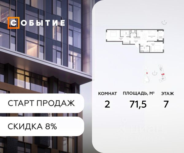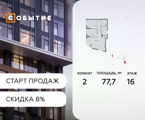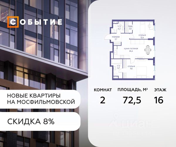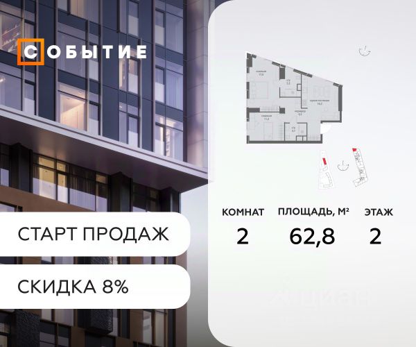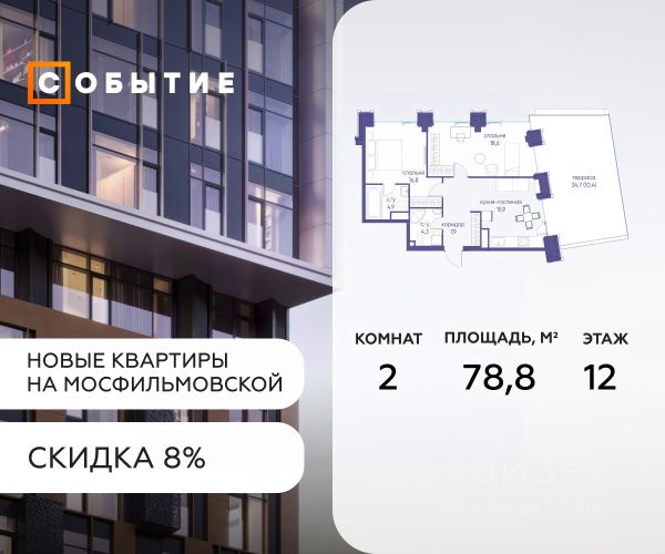 Около 10 минут до Москва Сити и ТТК! В продаже 2-к квартира от застройщика. Общая площадь 59.8, жилая 18.3, кухня 41.5. Квартира расположена на 2 этаже жилого квартала "Событие-6", корпус 2, Секция 2. Квартира без отделки. Срок сдачи: 4 кв. 2029 года. СОБЫТИЕ.6 — финальный дом парк квартала СОБЫТИЕ на Мосфильмовской, созданный для тех, кто хочет "заняться жизнью" здесь и сейчас и получать максимум от каждого дня. Стильная архитектура, продуманное благоустройство и богатый набор общественных пространств делают дом естественной сценой для ярких личных событий. Архитектура от бюро Atrium на базе дизайн кода британских LDA Design и UHA London. Лучшая новостройка страны 2025 года! Расположение: • Около 710 минут пешком до станций метро "Аминьевская" и "Мичуринский проспект" (в зависимости от маршрута) • Около 15 минут до Садового кольца • Около 25 минут до аэропорта Внуково • Рядом — ключевые магистрали (Кутузовский, Мичуринский, Ломоносовский проспекты, Аминьевское шоссе), что упрощает выезды как в центр, так и за город Инфраструктура "всё у дома" Главный центр притяжения — модный парк "Событие" от бюро Wowhaus. Благоустроенный бульвар и рекреационные зоны занимают около половины территории квартала, а природная часть парка площадью более 12 гектаров уже открыта. В парке проложены: • примерно 1,5 км беговых дорожек • около 2,7 км велодорожек • около 1,6 км экотропы • детские и спортивные площадки, места для пикника, лекторий, декоративный огород, восстановленные биотопы • Парк "Событие" — финалист конкурса Правительства Москвы в номинации "Строительство парков и общественных пространств" Мультидвор Двор СОБЫТИЯ.6 — это мультимодальное пространство для жителей всех возрастов. Здесь предусмотрены: • игровые и развивающие площадки для малышей и детей постарше • воркаут зоны, площадки для игр с мячом и йоги для активных взрослых • мини бульвар с фонтаном для прогулок • террасы, амфитеатры и лаунжи для спокойного отдыха и встреч • Комьюнити террасы и общественные пространства на кровле 10 этажа Внутри дома предусмотрен полный набор общественных пространств: • детская игровая комната и детский клуб • спортрум / фитнес рум • коворкинг и комнаты для занятий с репетитором • дизайнерские лаунж зоны для деловых и личных встреч Район и окружение: парки, университеты, спорт Район относится к числу самых экологичных в Москве: он буквально утопает в зелени парков и заповедников. В окружении — парк "Событие", природный заказник "Долина реки Раменки", Воробьевы горы, Матвеевский лес, парк 50 летия Октября, парк Олимпийской деревни, Вороновский парк, набережные Москвы реки, заказник "Долина реки Сетунь". Это настоящая "интеллектуальная миля" Москвы: рядом МГУ имени М. В. Ломоносова, ботанический сад МГУ, театр им. Н. И. Сац, Новодевичий монастырь, стадион "Лужники", Парк Победы и другие знаковые объекты. Район особенно комфортен для сторонников ЗОЖ: множество мест для бега, велопрогулок, спорта на открытом воздухе и занятий