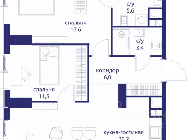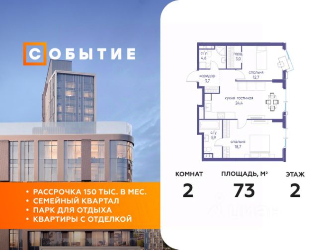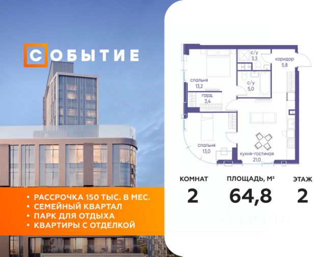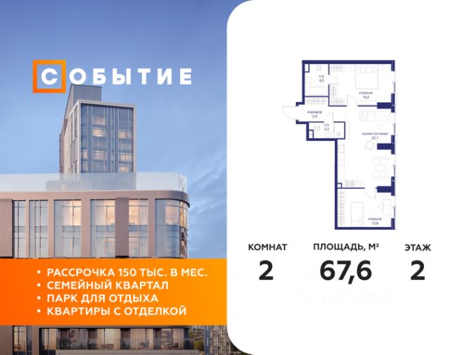 В продаже 2-к квартира от застройщика. Общая площадь 66.70, жилая 28.80, кухня 24.7. Квартира расположена на 8 этаже жилого квартала "Событие-6", корпус 1, Секция 1. Квартира без отделки. Срок сдачи: 4 кв. 2029 года. СОБЫТИЕ.6 — финальный дом парк-квартала СОБЫТИЕ на Мосфильмовской. Переезжайте в уже сформированный квартал с готовой инфраструктурой и парком! Премиальный жилой комплекс в престижном районе Москвы предлагает стильную архитектуру, продуманное благоустройство и великолепно разнообразие общественных пространств. Свой парк прямо возле дома! Архитектура Архитектура СОБЫТИЯ.6 выполнена в ультрасовременном стиле московским бюро Atrium на основе дизайн-кода британских архитекторов LDA Design и UHA London. Дом отличает оригинальная геометрия фасадов, большое остекление и высокие лобби (до 6,2 м) с авторской мебелью и светильниками. Расположение Мосфильмовская улица (Раменки) — один из престижных районов Москвы. Близость к историческому и деловому центру, природным зонам Запада столицы. Транспортная доступность: • 10 мин до Москва-Сити и ТТК; • 15 мин до Садового кольца; • 25 мин до аэропорта Внуково; • 7-10 мин до станций метро "Аминьевская" и "Мичуринский проспект". Инфраструктура: • парк "Событие" (12 га, финалист конкурса Правительства Москвы) с беговыми (1,5 км) и велодорожками (2,7 км), экотропой (1,6 км), площадками, лекторием; • школа, детский сад, магазины, салоны красоты, рестораны (к моменту заселения); • мультидвор с игровыми и спортивными площадками, мини-бульваром; • общественная терраса на 10-м этаже (коворкинг, лаунж); • Закрытые общественные пространства: детская комната, спортивный зал, коворкинг, лаунж-зоны. Паркинг 256 мест для жителей (48 — для электромобилей), 24 гостевых (5 — для электромобилей), мойки колес, кладовые, зоны для велосипедов. Окружение Парки и заповедники (Воробьёвы горы, Матвеевский лес и др.), МГУ, театр им. Н. И. Сац, стадион "Лужники". Безопасность Видеонаблюдение, контроль доступа, видеодомофоны, консьерж-сервис 24/7, системы пожарной безопасности и мультисервисная оптическая сеть.