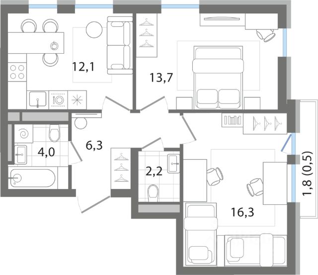 Продаётся 2-комнатная квартира в сданном доме (Театральный, к1), срок сдачи: I-кв. 2025, общей площадью 55.1 кв.м., на 2 этаже. Бутик-квартал "G3 Театральный"