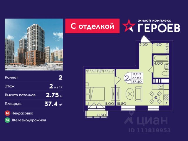 Продаётся 2-комнатная квартира 31.2 кв. м. в жилом комплексе "Героев" в Балашихе, Железнодорожный. Квартира расположена на 5 этаже 407 корпуса. Все квартиры представлены с чистовой отделкой. Вам не нужно тратить время и дополнительные финансы на ремонт или жить в шуме строительных работ - достаточно перевести свои вещи, расставить мебель и всё готово! Жилой квартал "Героев" - это уютный проект для семей с детьми. Всего 40 минут до центра Москвы. В квартале созданы все условия для досуга всех возрастов: игровые и спортивные площадки, места для отдыха и прогулок, магазины, кафе и пункты выдачи. За 15 минут можно дойти от дома до Ольгинского лесопарка - популярного места для прогулок и отдыха на свежем воздухе. Здесь приятно гулять всей семьёй, заниматься спортом или устроить пикник в выходной день. Преимущества: Квартира с готовой отделкой. Пространство полностью подготовлено для жизни: не нужно тратить время и деньги на ремонт или ждать его окончания. После получения ключей достаточно расставить мебель - и можно сразу заезжать и жить. Продуманные и светлые планировки. Просторные кухни-гостиные создают комфортное пространство для отдыха и встреч с близкими. В квартирах предусмотрены удобные гардеробные, благодаря чему легко поддерживать порядок и не перегружать комнаты шкафами. Увеличенное остекление. Большие окна наполняют квартиру естественным светом в течение всего дня, создавая ощущение простора и уюта, а также визуально расширяя пространство и делая интерьер более воздушным. Пешая доступность до станции Железнодорожная (МЦД-4) - дорога займёт не более 30 минут до центра Москвы: станции метро "Курская", "Площадь Ильича" или ТПУ Нижегородская.