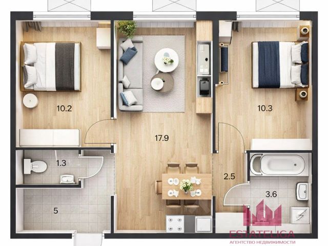 - план: кухня-гостиная и две спальни, две гардеробные и два сан.узла, почти все стены не несущие;