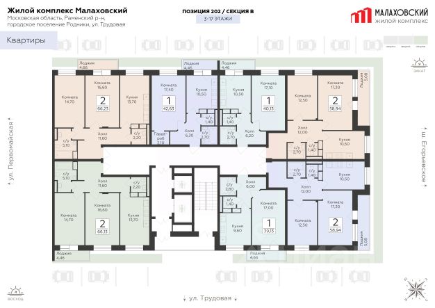 Продается 2-к квартира площадью 63.9 кв. м без отделки. Квартира расположена на 2 этаже 17 этажного дома, в 203 корпусе. "Малаховский" - жилой комплекс в Раменском районе Подмосковья, идеально подходящий для семей с детьми. Проект от федерального застройщика ГК "Развитие" находится в тихом и зеленом микрорайоне Родники и отличается удобной транспортной связью с Москвой и Люберцами. Три дома высотой 17 этажей с видами на озеро и парк, просторные квартиры, приватный двор-патио с ландшафтным дизайном и доступная инфраструктура обеспечат жителям новых квартир все преимущества городской жизни в живописном природном окружении. Транспортная доступность - Удобный выезд на Егорьевское шоссе и строящуюся магистраль МЕТК (Москва - Егорьевск - Тума - Касимов); - 18 км от МКАД; - 5 мин. до МЦД-3 "Удельная"; - 29 мин. до метро "Лермонтовский проспект". Архитектура Дома отличаются высокой тепло- и шумоизоляцией, долговечностью, высоким уровнем энергоэффективности и современным внешним видом. Фасады выполнены в спокойной цветовой гамме. Из окон с широкоформатным остеклением открываются виды на березовую рощу, озеро и зеленые дворы. Логичным продолжением архитектуры становятся просторные входные группы, где продумано всё: витражное остекление, высокие потолки, дизайнерская отделка, два выхода на обе стороны дома, а также современные лифты (грузовой и пассажирский) и колясочные. Планировочные решения Планировки комплекса "Малаховский" функциональны и эргономичны, что упрощает зонирование и расстановку мебели. Квартиры оснащены гардеробными, лоджиями с панорамным остеклением, двумя санузлами (даже в однокомнатных) и просторными прихожими. Высота потолков - 2,7 м. Квартиры сдаются с отделкой white box, которая позволит воплотить индивидуальный дизайн-проект по своему вкусу. Доступны варианты отделки "под ключ" с применением лучших дизайнерских материалов. Благоустройство В жилом комплексе тщательно продумана концепция благоустройства. Через всю территорию тянутся живописные прогулочные бульвары с ландшафтным дизайном и всесезонным озеленением. Рядом обустроено 3 современных детских площадки с мягким покрытием, а для взрослых предусмотрены уютные лаунж-зоны для общения, тихого отдыха и спорта на свежем воздухе. Двор каждого дома свободен от машин, а для дополнительного уюта и безопасности здесь установлено современное освещение. Естественным продолжением дворового ландшафта становится березовая роща с природными тропинками и небольшим водоемом, прилегающая к жилому комплексу. Инфраструктура и окружение - Наземный паркинг на 55 машино-мест и гостевая парковка; - Все повседневные сервисы (кафе, магазины, салоны красоты) прямо в вашем доме; - Фитнес-клуб, бассейн, спортивные площадки и велодорожки в многочисленных парках микрорайона Родники; - 2 школы, гимназия и детский сад в шаговой доступности; - ТЦ "Родники" с рестораном и супермаркетом; - Петропавловский парк с благоустроенным детским городком и волейбольной площадкой;