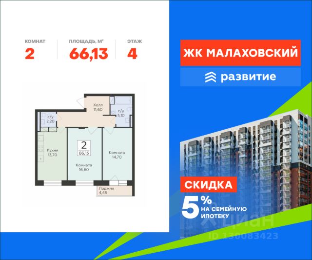 Продается 2-комнатная квартира площадью 66.13 с отделкой White box. Квартира расположена на 4 этаже 17 этажного дома, в 201 корпусе. "Малаховский" - жилой комплекс в Раменском районе Подмосковья, идеально подходящий для семей с детьми. Проект от федерального застройщика ГК "Развитие" находится в тихом и зеленом микрорайоне Родники и отличается удобной транспортной связью с Москвой и Люберцами. Три дома высотой 17 этажей с видами на озеро и парк, просторные квартиры, приватный двор-патио с ландшафтным дизайном и доступная инфраструктура обеспечат жителям новых квартир все преимущества городской жизни в живописном природном окружении. Транспортная доступность - Удобный выезд на Егорьевское шоссе и строящуюся магистраль МЕТК (Москва - Егорьевск - Тума - Касимов); - 18 км от МКАД; - 5 мин. до МЦД-3 "Удельная"; - 29 мин. до метро "Лермонтовский проспект". Архитектура Дома отличаются высокой тепло- и шумоизоляцией, долговечностью, высоким уровнем энергоэффективности и современным внешним видом. Фасады выполнены в спокойной цветовой гамме. Из окон с широкоформатным остеклением открываются виды на березовую рощу, озеро и зеленые дворы. Логичным продолжением архитектуры становятся просторные входные группы, где продумано всё: витражное остекление, высокие потолки, дизайнерская отделка, два выхода на обе стороны дома, а также современные лифты (грузовой и пассажирский) и колясочные. Планировочные решения Планировки комплекса "Малаховский" функциональны и эргономичны, что упрощает зонирование и расстановку мебели. Квартиры оснащены гардеробными, лоджиями с панорамным остеклением, двумя санузлами (даже в однокомнатных) и просторными прихожими. Высота потолков - 2,7 м. Квартиры сдаются с отделкой white box, которая позволит воплотить индивидуальный дизайн-проект по своему вкусу. Доступны варианты отделки "под ключ" с применением лучших дизайнерских материалов. Благоустройство В жилом комплексе тщательно продумана концепция благоустройства. Через всю территорию тянутся живописные прогулочные бульвары с ландшафтным дизайном и всесезонным озеленением. Рядом обустроено 3 современных детских площадки с мягким покрытием, а для взрослых предусмотрены уютные лаунж-зоны для общения, тихого отдыха и спорта на свежем воздухе. Двор каждого дома свободен от машин, а для дополнительного уюта и безопасности здесь установлено современное освещение. Естественным продолжением дворового ландшафта становится березовая роща с природными тропинками и небольшим водоемом, прилегающая к жилому комплексу. Инфраструктура и окружение - Наземный паркинг на 55 машино-мест и гостевая парковка; - Все повседневные сервисы (кафе, магазины, салоны красоты) прямо в вашем доме; - Фитнес-клуб, бассейн, спортивные площадки и велодорожки в многочисленных парках микрорайона Родники; - 2 школы, гимназия и детский сад в шаговой доступности; - ТЦ "Родники" с рестораном и супермаркетом; - Петропавловский парк с благоустроенным детским городком и волейбольной площадкой; - Благоустроенная бе