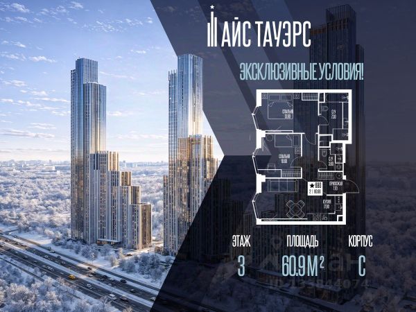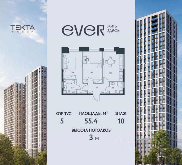 2-комн. квартира в ЖК "Ever" на 4 этаже в 34 этажном здании Корпус 5. Общая площадь: 55.4 кв.м., жилая: 29.5 кв.м. Высота потолков 3.00 м.